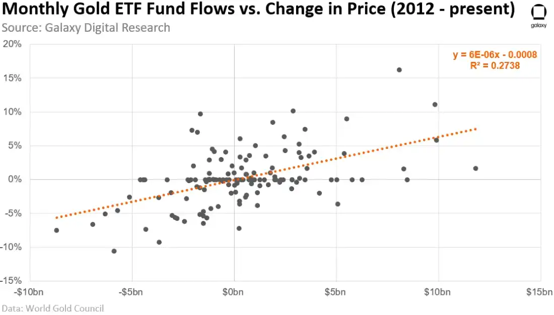 如果我们将我们第一年的资金流入估算为 144 亿美元(每月约 12 亿美元,或根据我们的 8.8 倍乘数调整后约 105 亿美元),并将其应用到黄金 ETF 基金流入与黄金价格变化的历史关系中,我们估计比特币在第一个月的价格影响为正 6.2%。
