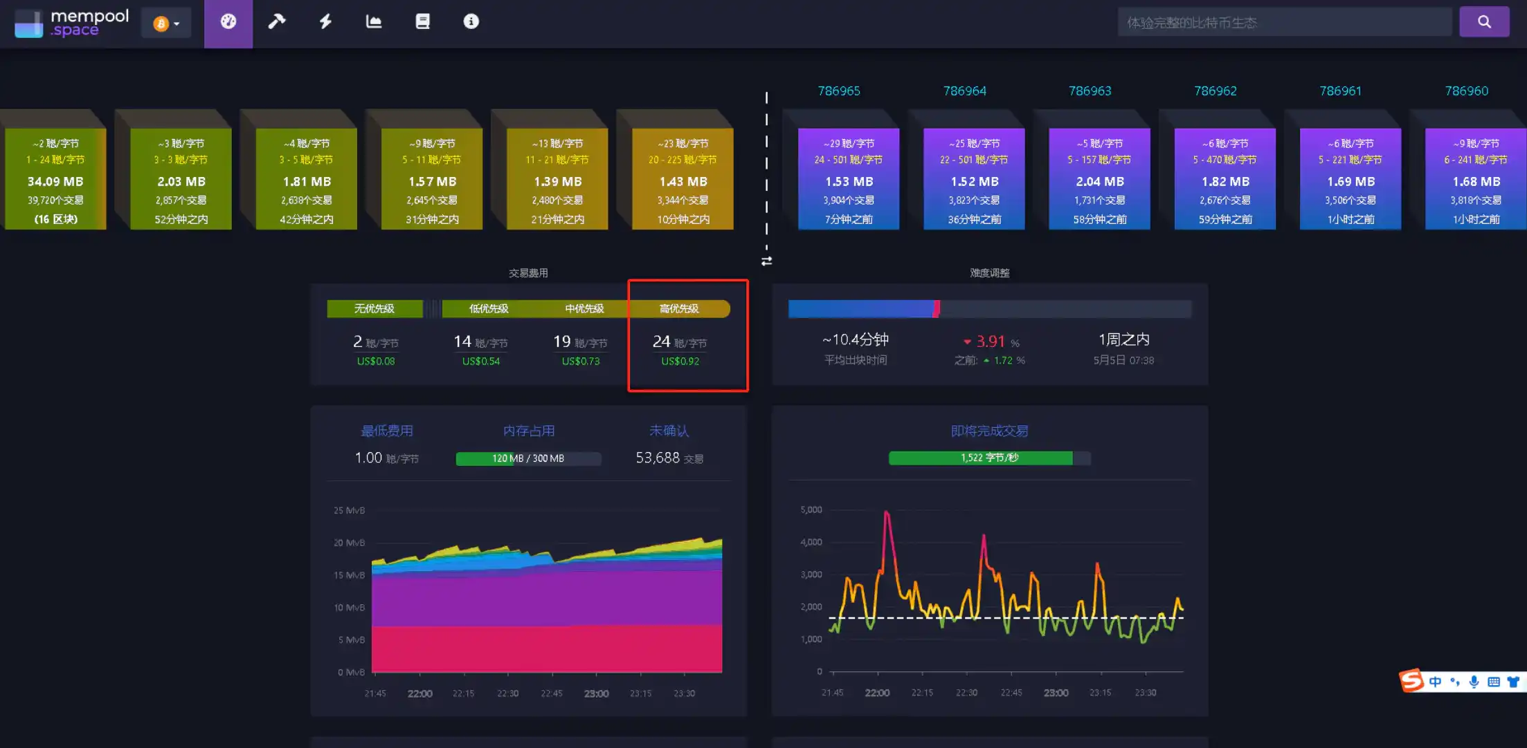 我又看了下实时 GAS,这时候链上最高已经跑到了 24 聪了,难怪等了 1 小时了还没出块。