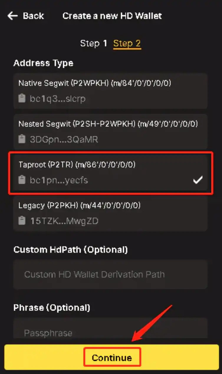创建钱包,备份助记词,选择地址的时候,选择后面为 m/86/0/0/0,然后确认。