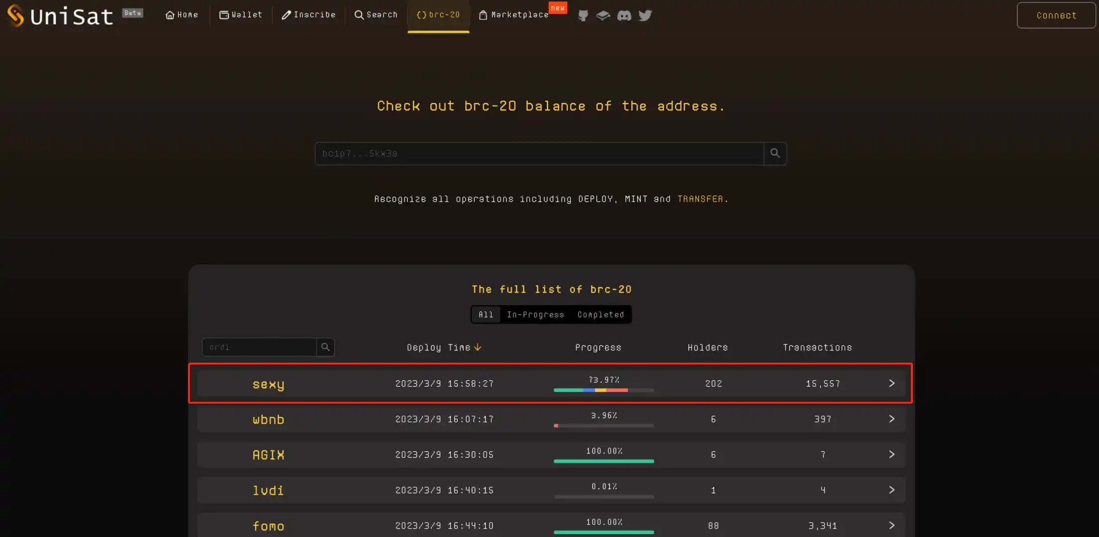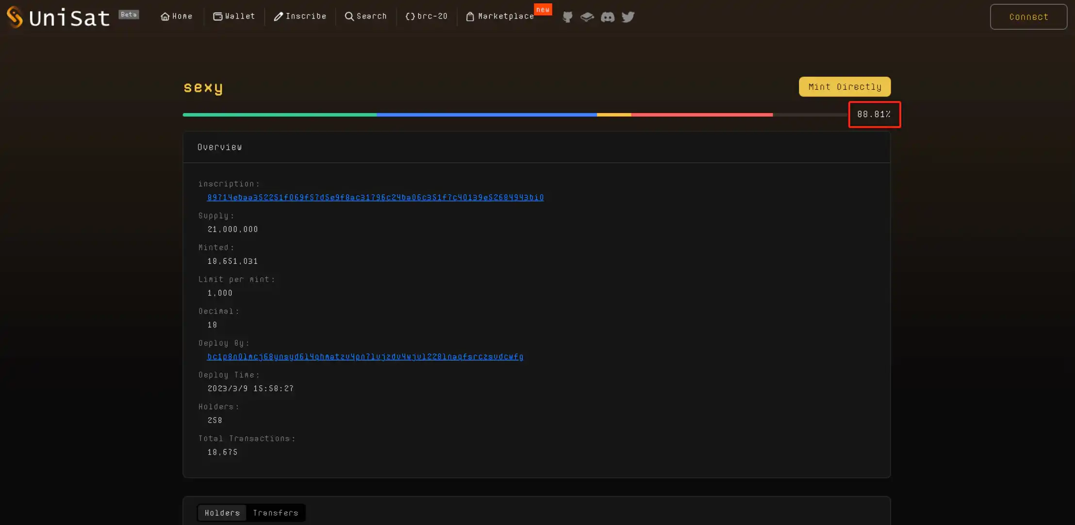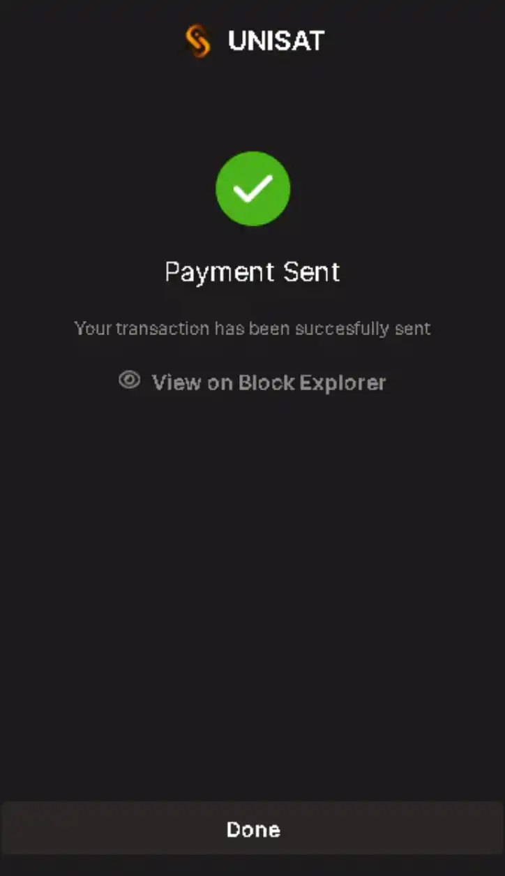 在打开 unisat 查看 sexy 实时铸造情况,这里看到显示还没铸造完成,说明我们后面拉 25 聪 gas 铸造的代币属于有效的。