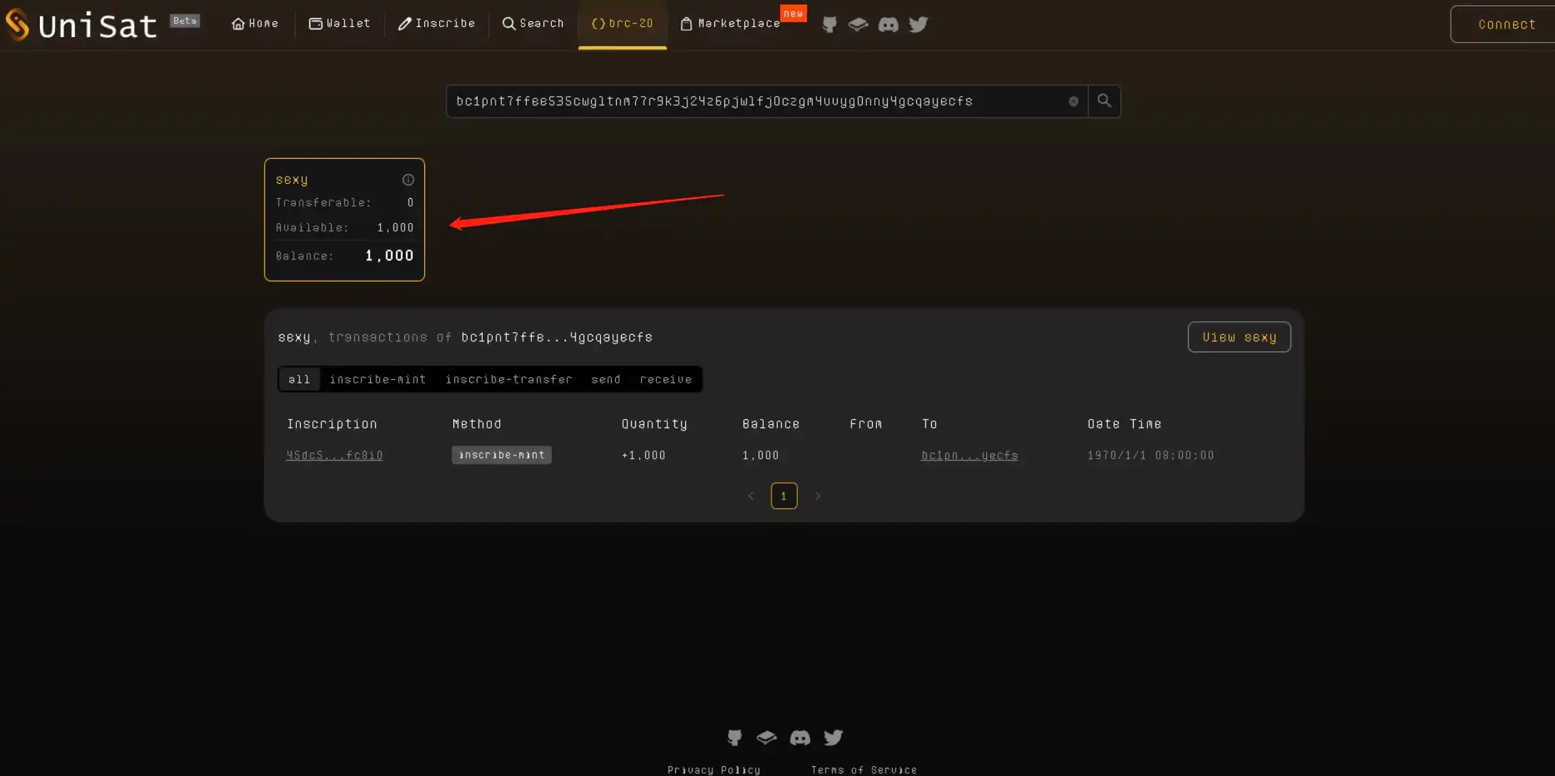 这时候如果你去 unisat 上查 brc20 资产会显示已经有 sexy 的资产,不过还不是你的,因为你的铭文还没出块,需要耐心等待。(unisat 会显示内池的铭文,所以会提前显示资产,最终看链上出块情况)