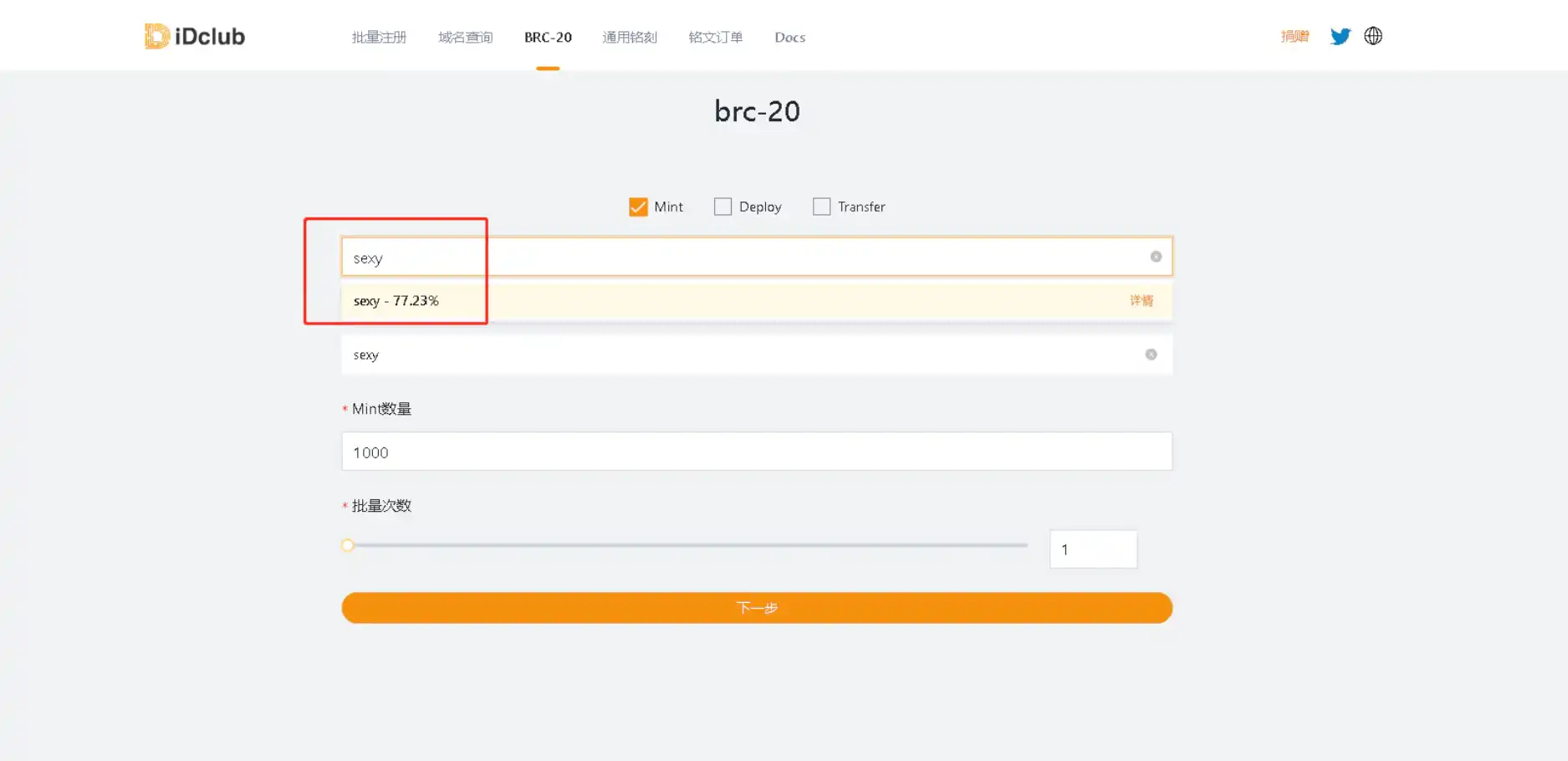 方法二(推荐):不用复制 UniSat 的,直接第一栏直接搜索代币名称 点击下 可自动填写(新功能超级便捷,不会填错)我这里选择铸造 1 张为实例。