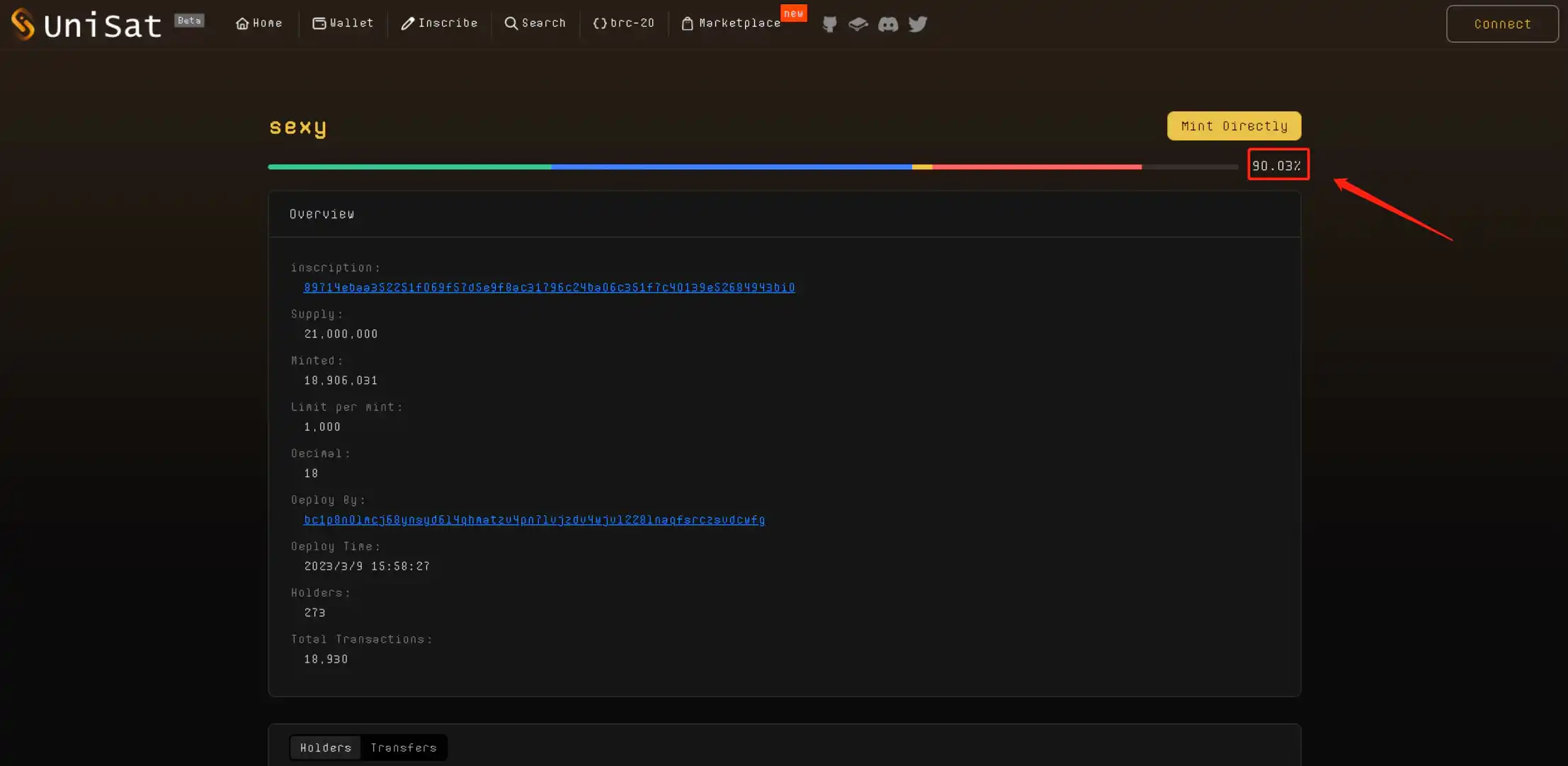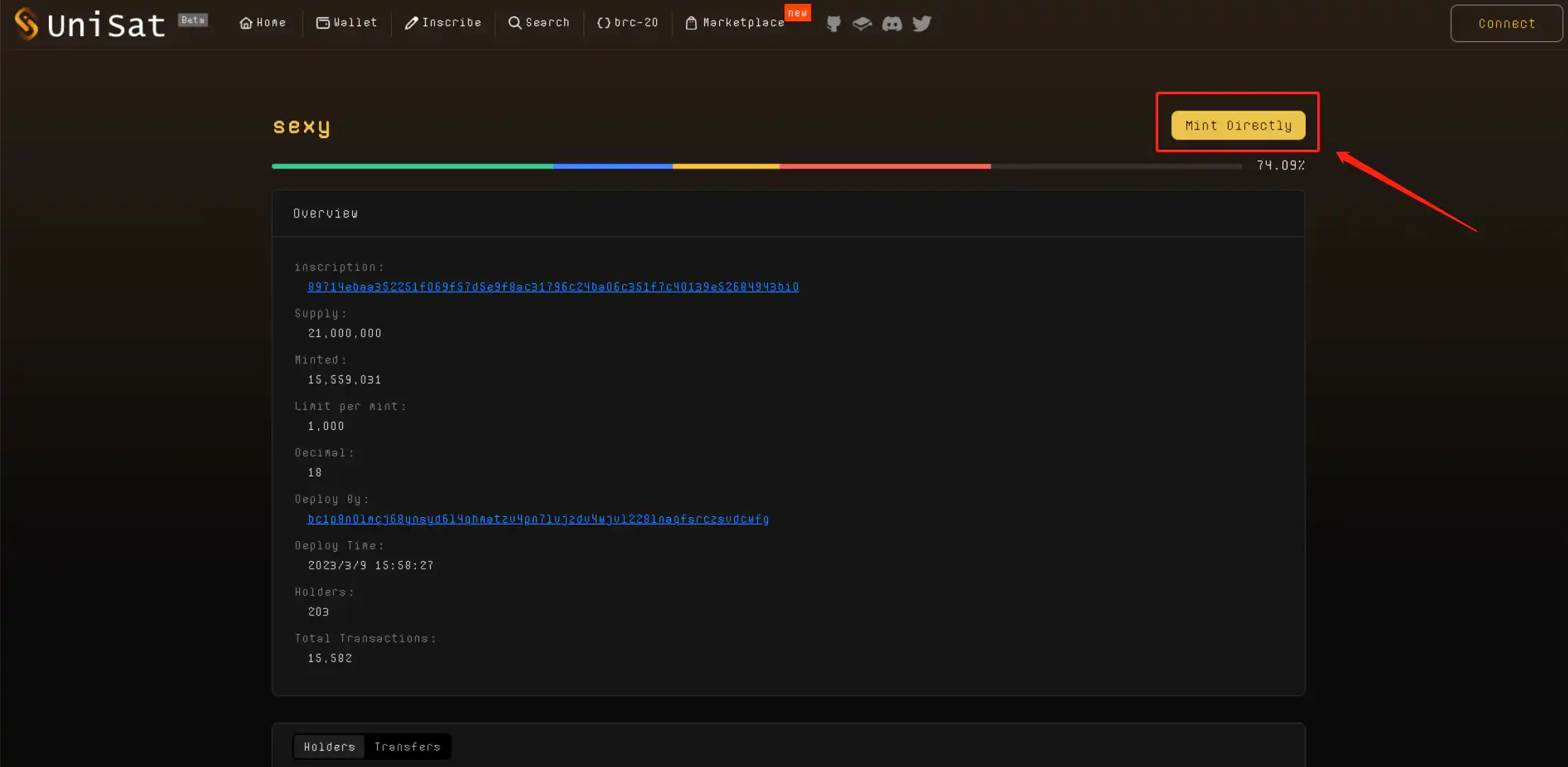 这个 sexy 代币为实例,这里可以看到已经铸造了 74% 左右了,持有人不是很健康,才 202 人,筹码有点集中。(因为铸造过半了,可能等会 会加快铸造完)