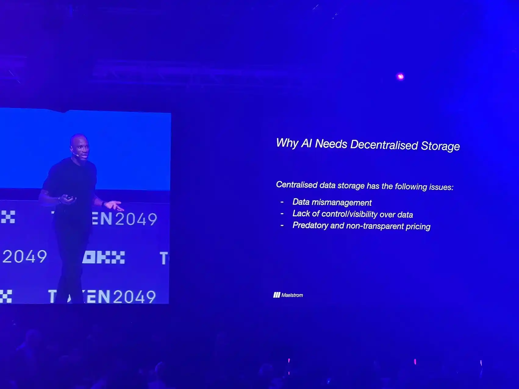 为什么 AI 需要去中心化存储呢?如果我相信 AI 不会使用大量数据存储,我不应该使用亚马逊吗?你将数据放在一个中心化的公司里,这家公司可以因为政府的命令而关闭您的服务,可以随时更改价格,因为那是它们的数据中心,它还可以随时取消合同。AI 会怎么做呢?它会去法庭起诉某人吗?这不会发生的。从根本上说,AI 将创造一个去中心化存储的机会。