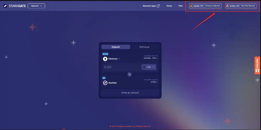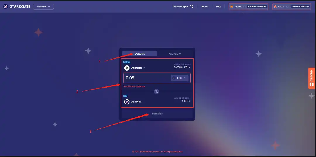 点击 Deposit, 输入存入的数量, 点击 transfer 存入 stark 主网