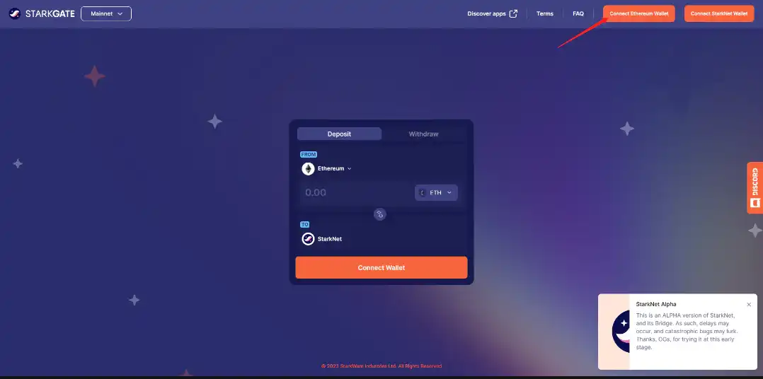打开 starkgate.starknet.io 官方跨链桥点击连接 metamask