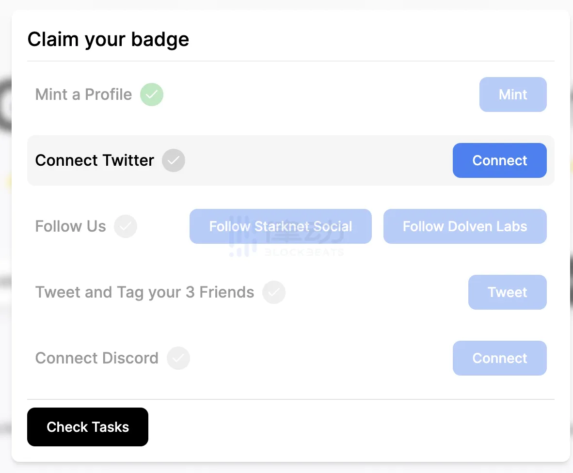 最后可以领取到属于自己的徽章,该徽章很大概率是未来 Starknet Social 的空投凭证,若你拥有 Dolven Labs 的 OG testnet 角色,还会额外获得一个忠诚度徽章。