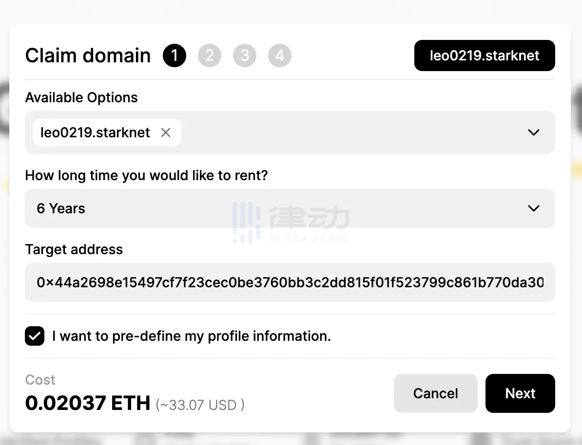 -域名后缀有上图 7 个选项,(.cairo——.starknet,如上图示)