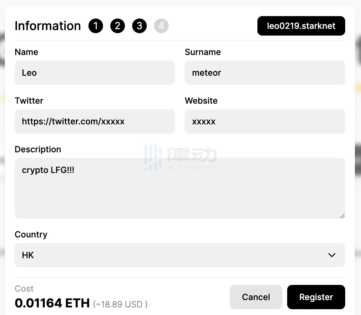 根据提示填写完成后,点击注册,授权钱包(此过程需要一些时间,正常约为 25 min)。