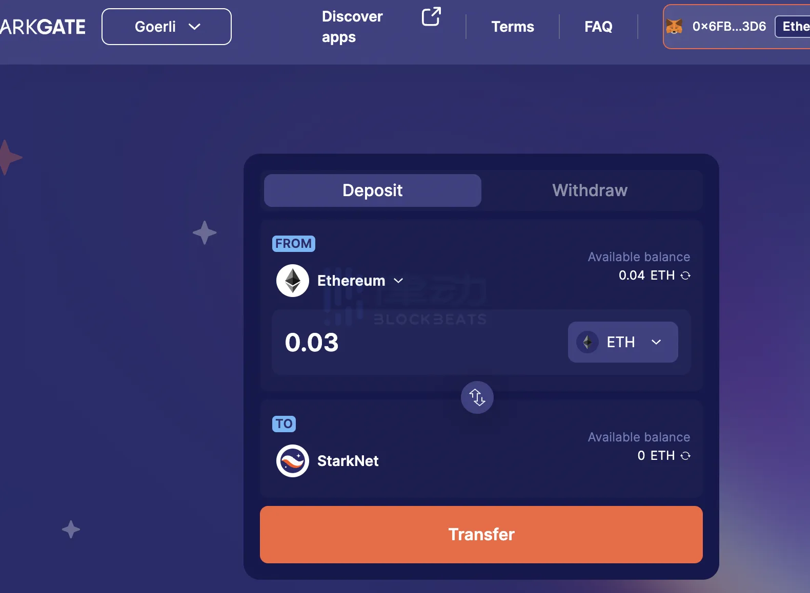 需选择 Goerli 网络,分别连接并授权小狐狸与 Braavos,点击 Transfer 进行跨桥,然后在小狐狸上确认资产跨桥。