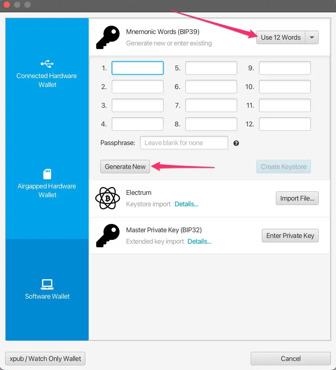 选择 12 个助记词,点击 generate new,自动生成 12 个,记好,一会儿还要重写一遍。记好后点击 confirm backup。