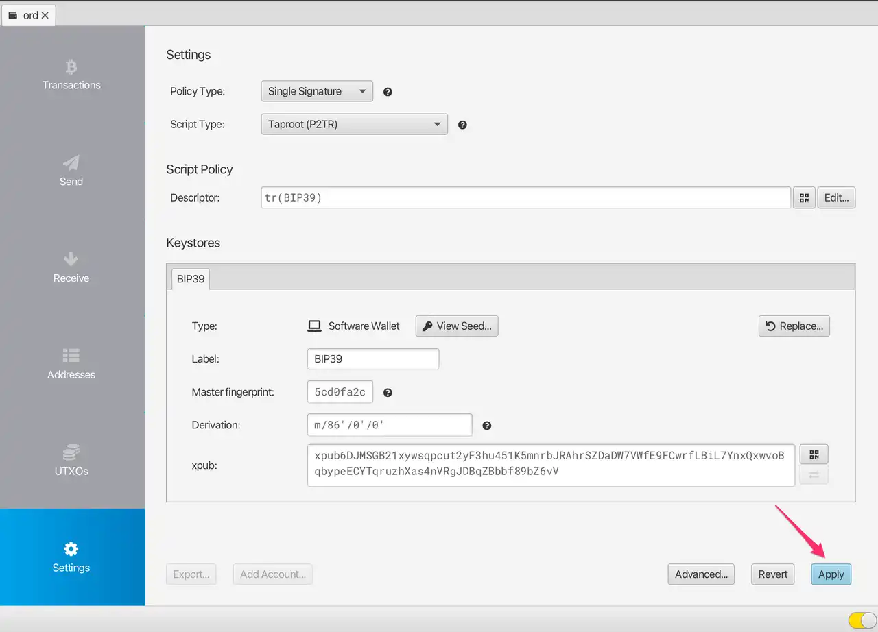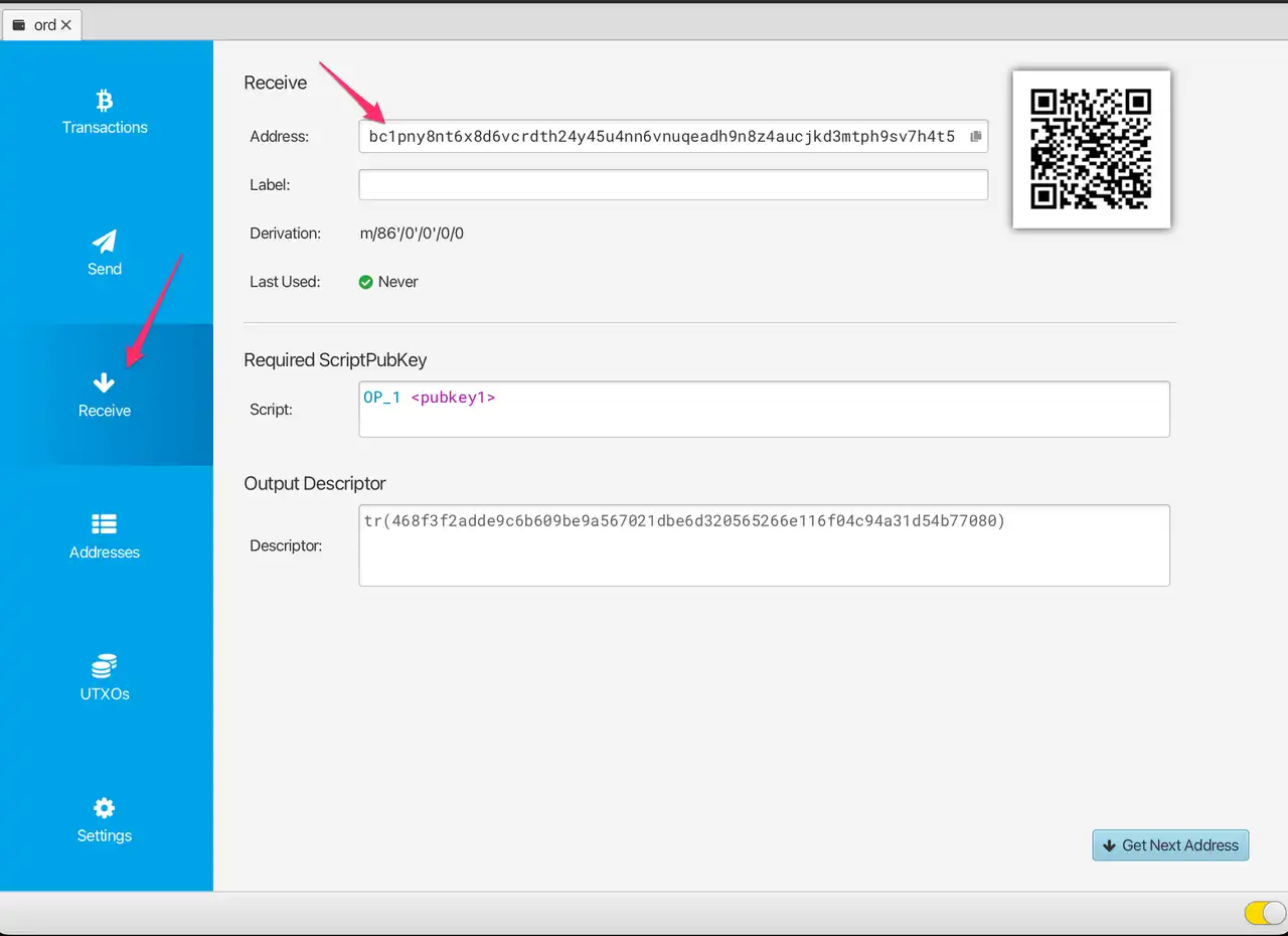 这样一个新的比特币钱包就设置好了,address 就是你的地址,一会儿 mint 的时候需要。