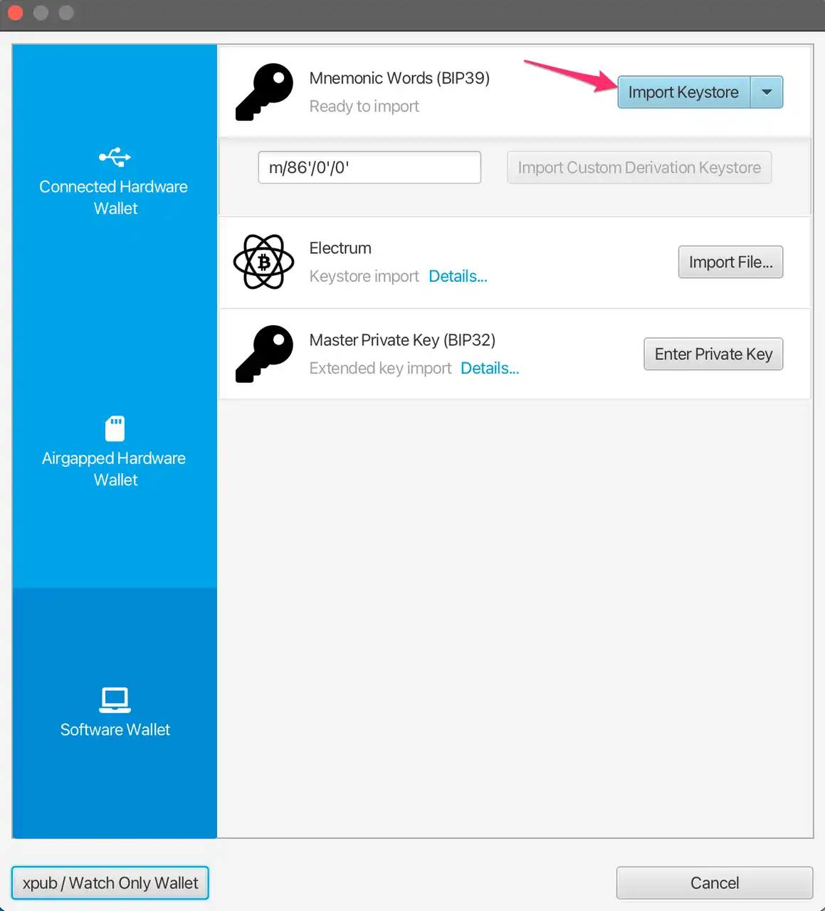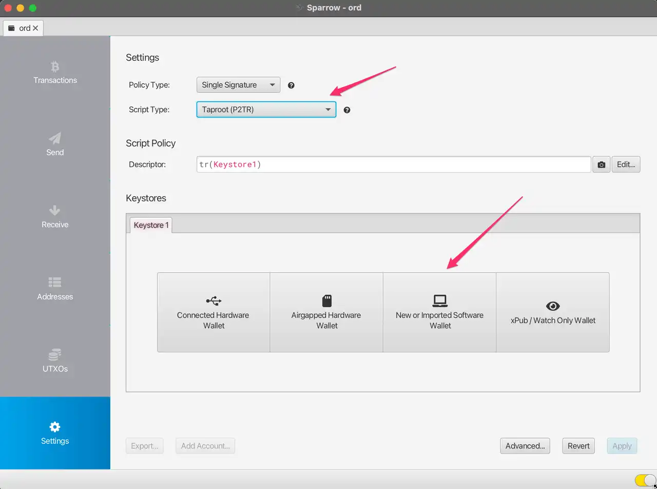 随后将 script type 换为 taproot(p2tr),然后点击 new or imported software wallet。