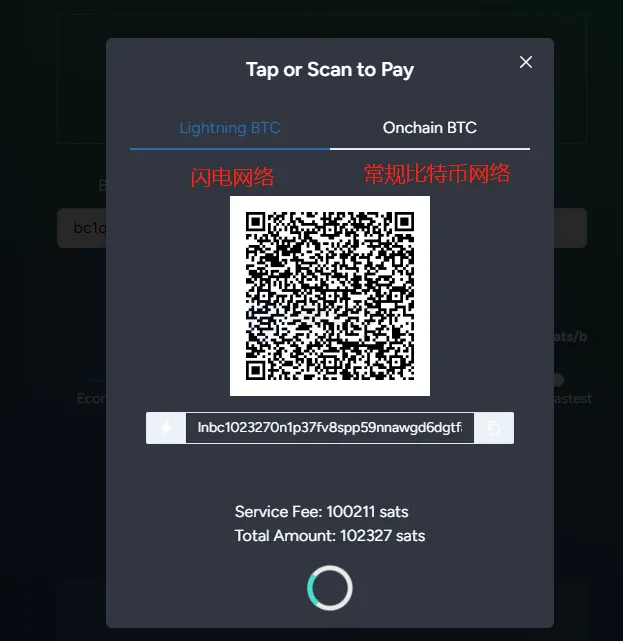 点击生成付款 Invoice 后,网页会弹出付款 Invoice 码,可以选择通过闪电网络或者比特币常规网络进行支付。理论上闪电网络会快一些。付款完成后,等待转账确认即可。(注:支付钱包可以与接收 NFT 的钱包地址不同。)