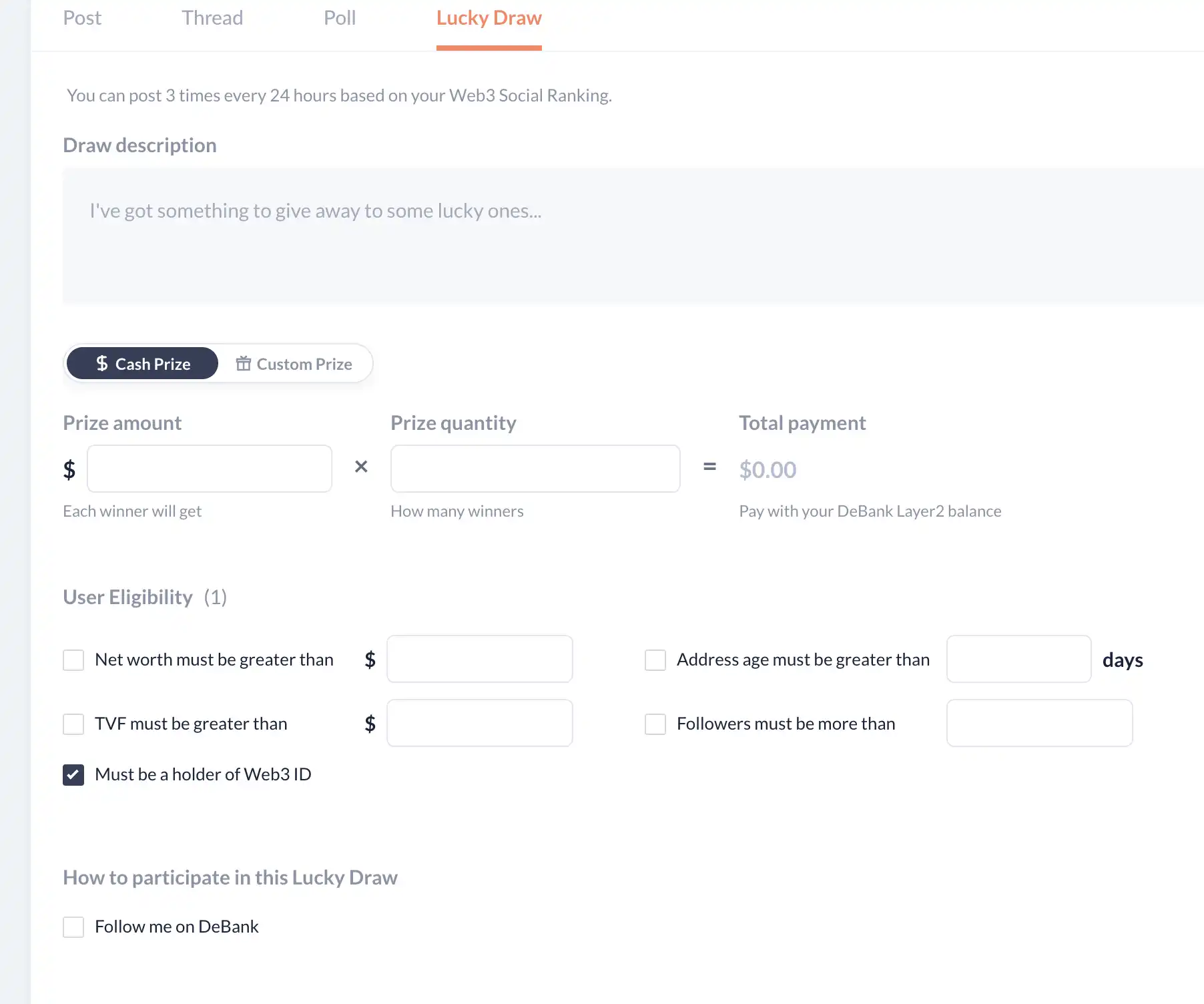 更为创新的是,DeBank Stream 应用还附带抽奖功能,关注发起抽奖用户后,用户可以描述抽奖具体内容,随后选择抽奖金额、数量、参与人范围等。