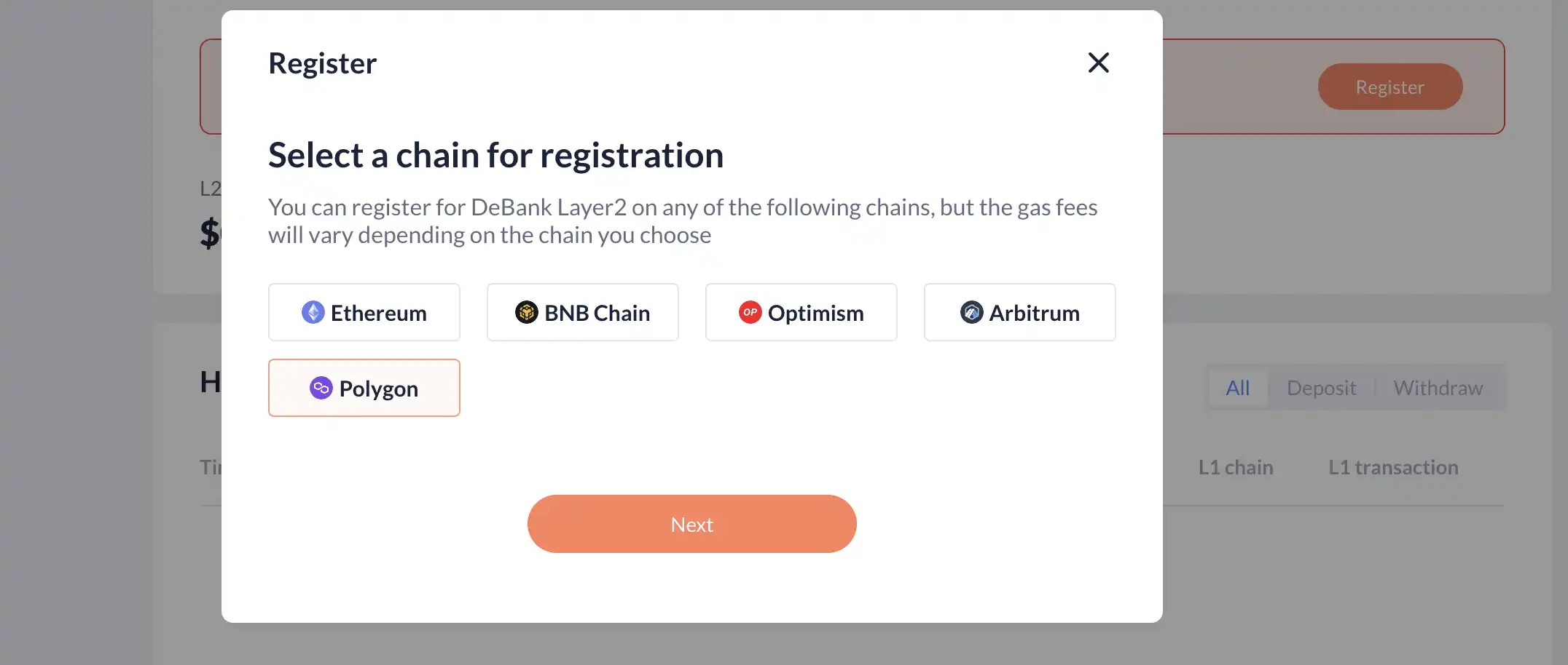 点击 DeBank L2 Unregistered,选择 OP、Arb 或 Polygon 链(Gas 较低);