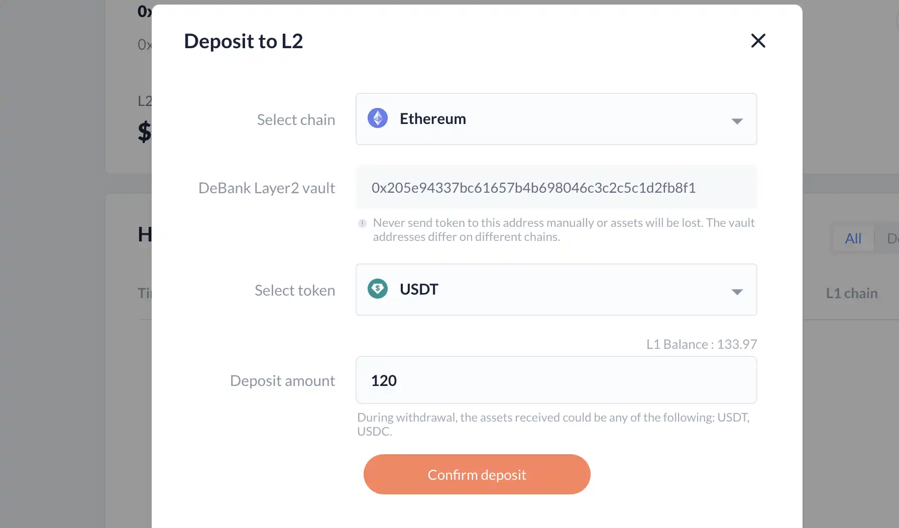 完成后选择 Deposit L2,选取有 USDT/USDC 资产的链,将 100u 以上的 U 存入DeBank L2,此外,还可以随时提现资产回 L1;