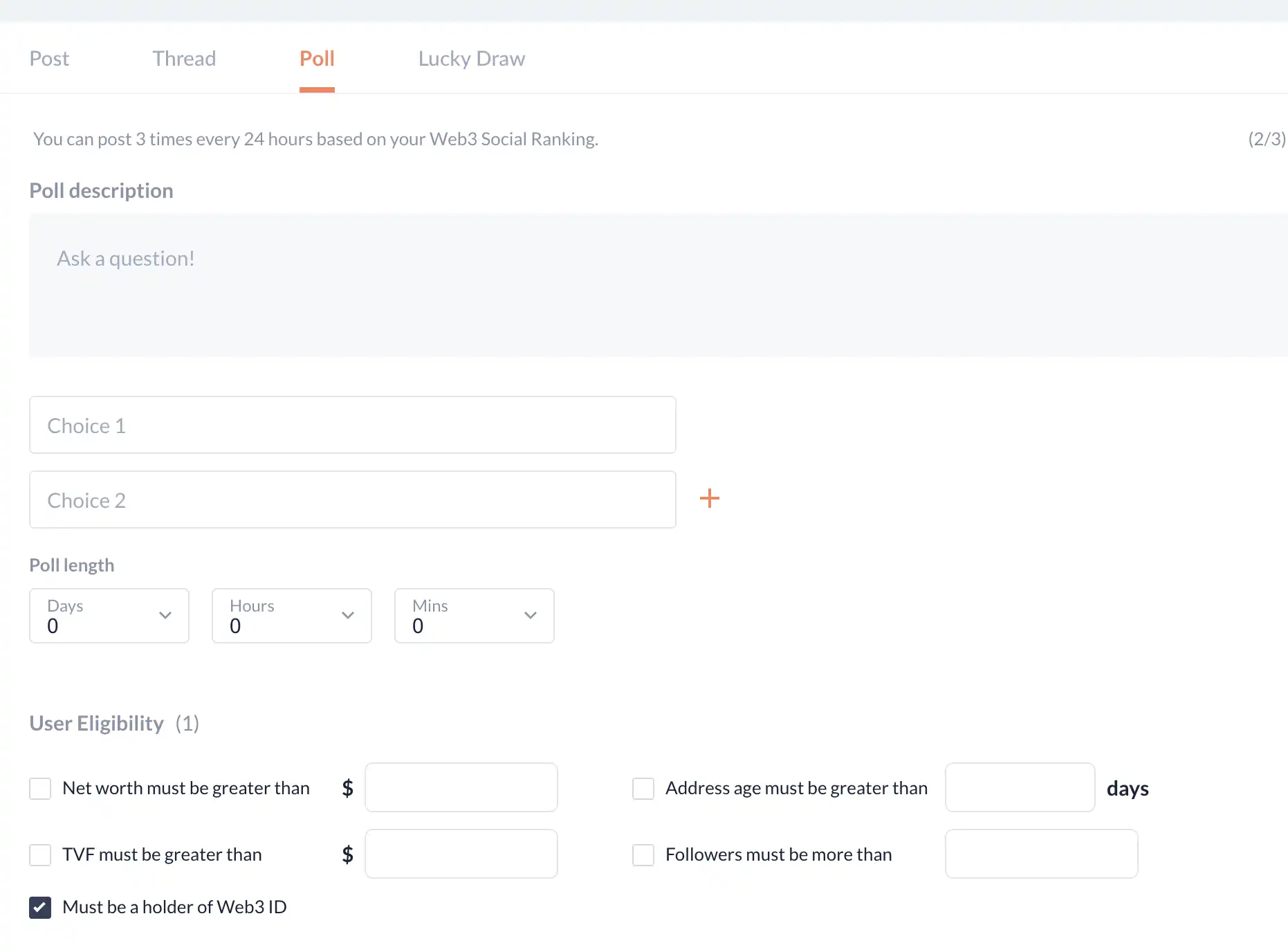此外,DeBank 上也能发布 Threads 和 Poll(类似推特),对于 Poll(投票调查)来说,用户可以选择问题、选项,还可以对回答问题的用户进行范围设定,比如用户资产、用户 TVF、地址的新老程度以及关注者的数量。