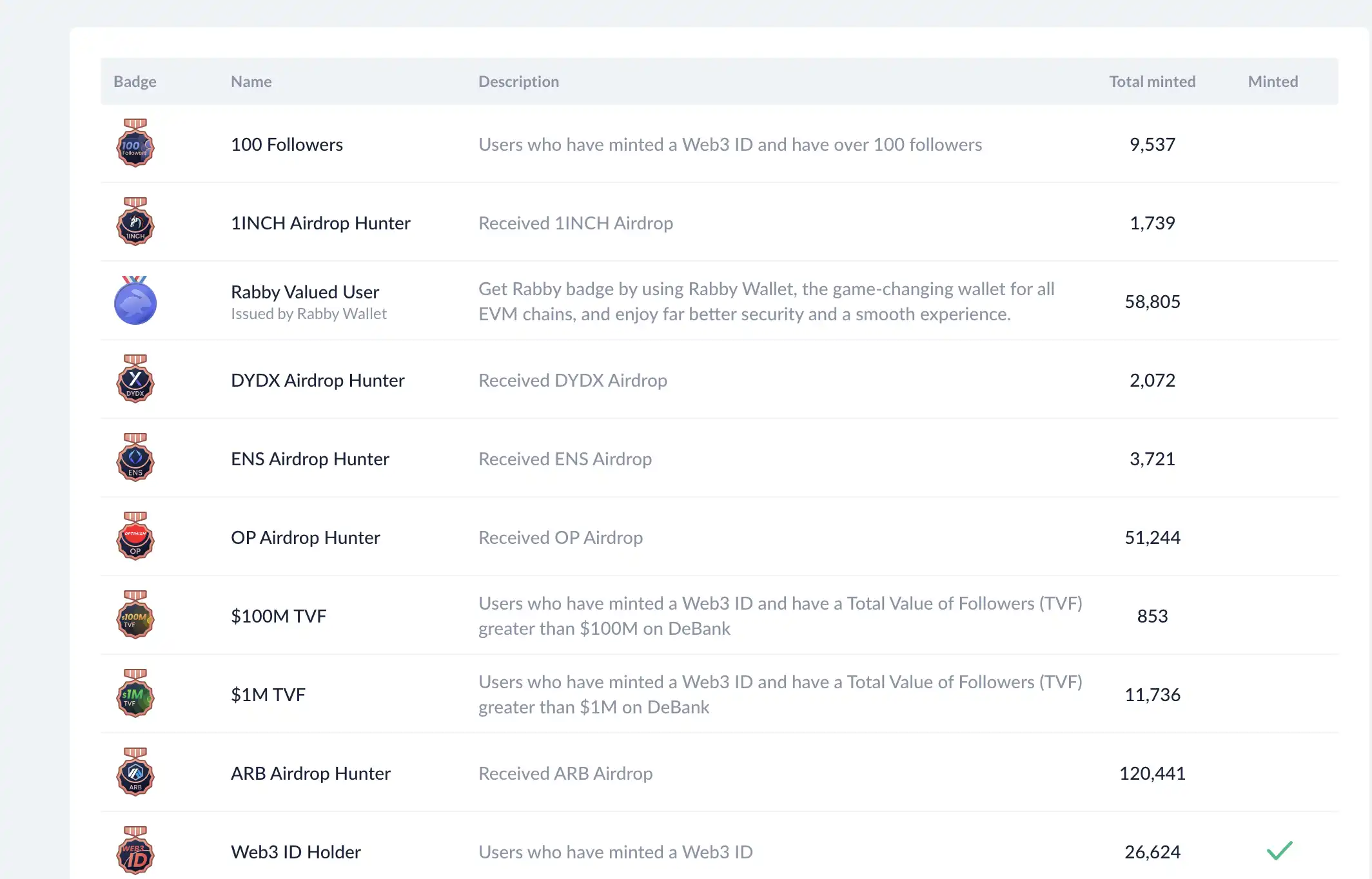 完成后就可以根据自己喜好在该平台上发布一些内容,此外,还可以在 DeBank Stream 上 mint 一些徽章,比如关注着超过 100,收到过项目空投(1INCH、ARB、OP、DYDX 等)的钱包,在以太坊主网花费超过一定金额 ETH Gas 的钱包等,这些徽章未来可能会是一些奖励的标准;