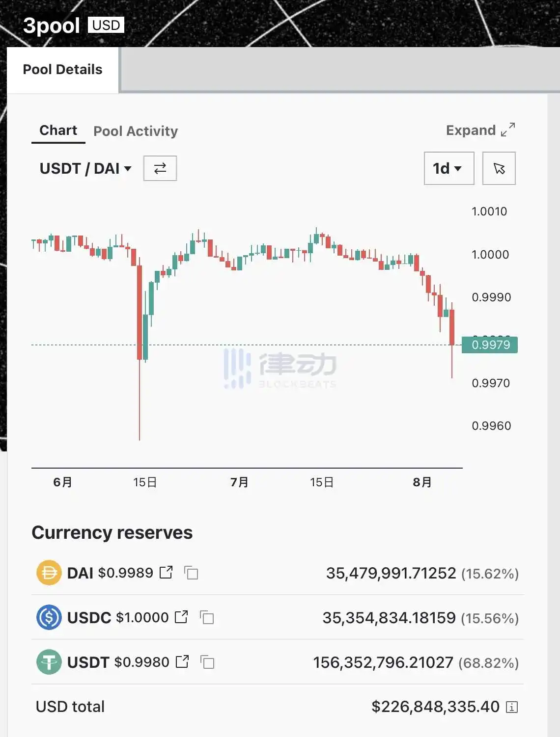 虽然 USDT 发行商 Tether 首席技术官 Paolo Ardoino 表示,PayPal 稳定币的推出不会影响 Tether,因为该公司不为美国用户提供服务。但在 PayPal 稳定币推出的消息不久后,据 Curve 官方数据显示,当前 3pool 中 USDT 占比已达 68.82%(156,352,796 枚),USDT 已出现轻微脱锚,跌至 0.9979 美元附近。