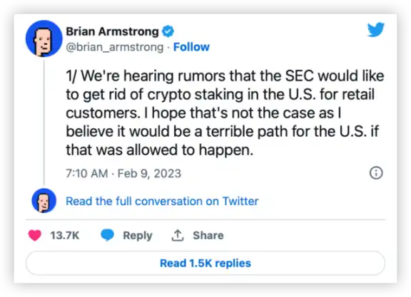 据媒体报道,Coinbase 的 CEO Brian Armstrong 已在周三晚间了解到了 Kraken 和 SEC 的和解协议。他指责 SEC 想要彻底剥夺散户参与链上质押的机会,并且称质押「是一项非常重要的创新」。