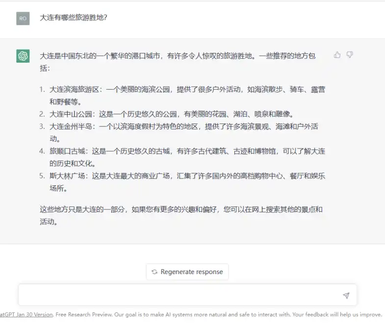 举一个容易理解的例子,飒姐团队在 ChatGPT 聊天框中输入问题「大连有哪些旅游胜地?」如下图所示: