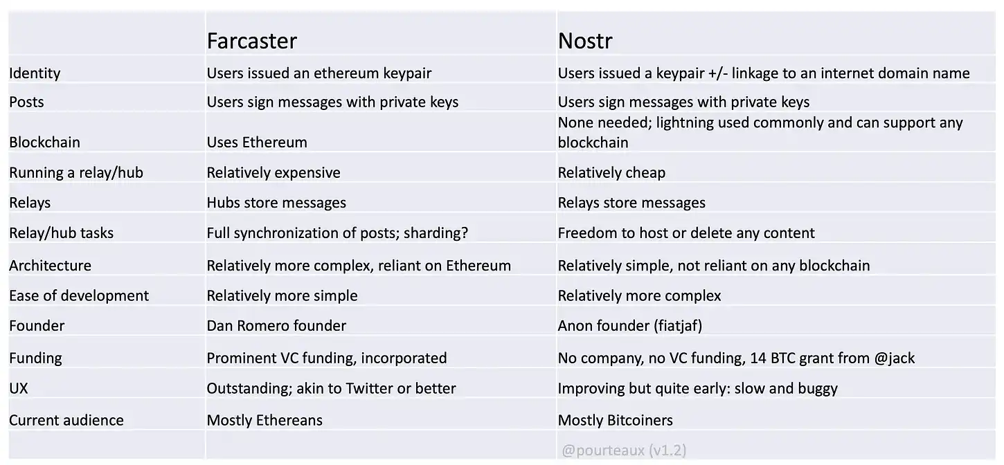Nostr 目前的用户群主要是比特币用户,而 Farcaster 的用户群主要是以太坊用户以及科技企业家。在很多方面,这也体现在每个平台的设计选择上。与比特币一样,Nostr 优先考虑简单性、中立性以及运行你自己的中继器(如比特币中的节点)的便利性。与比特币一样,Nostr 避开风险投资,成立公司或拥有知名创始人。使用 Farcaster 运行一个 hub 要更加困难和昂贵,但 Farcaster 断言称,某些设计权衡仍然允许「充分的去中心化」,同时优先考虑更近期的用例以及几乎为零售用户准备好的优化产品。
