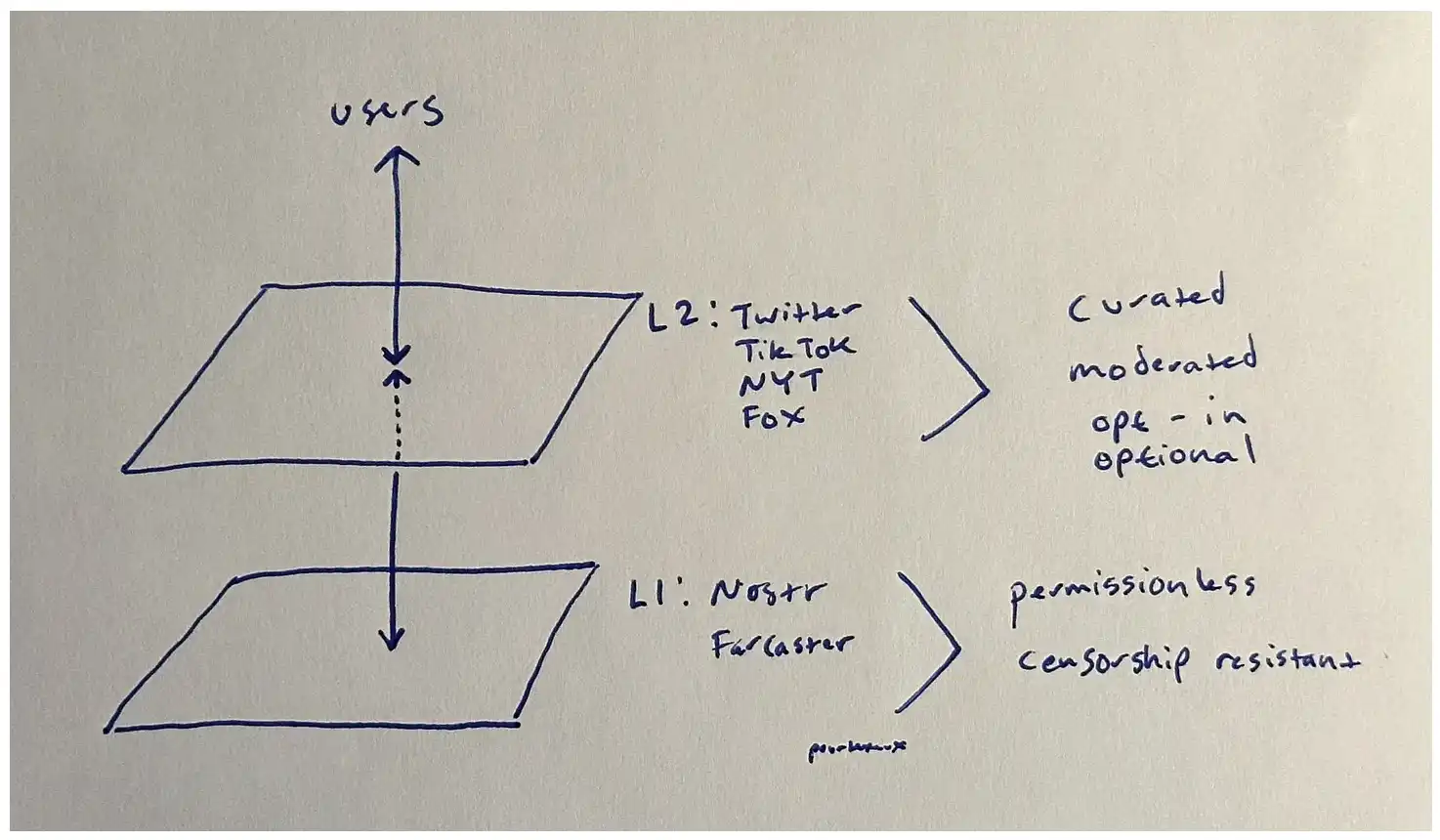 像 Nostr 或 Farcaster 这样的协议可以是无需许可和抗审查的,因为在一个分布式网络中,没有人可以向其发送删除请求。当然,这是一个尚未完善的的解决方案,因为如果你停在这里,那么你得到的只有一个分布式的 4chan,这基本没有人会感兴趣。你需要一个第二层的私盈公司和客户来充当策展人和版主。用户可以选择加入并为这个管理层付费,以提供更好的体验。根据你的世界观,你可以从《纽约时报》或《Joe Rogan Experience》的第 2 层策展付费。