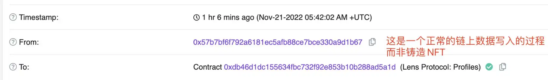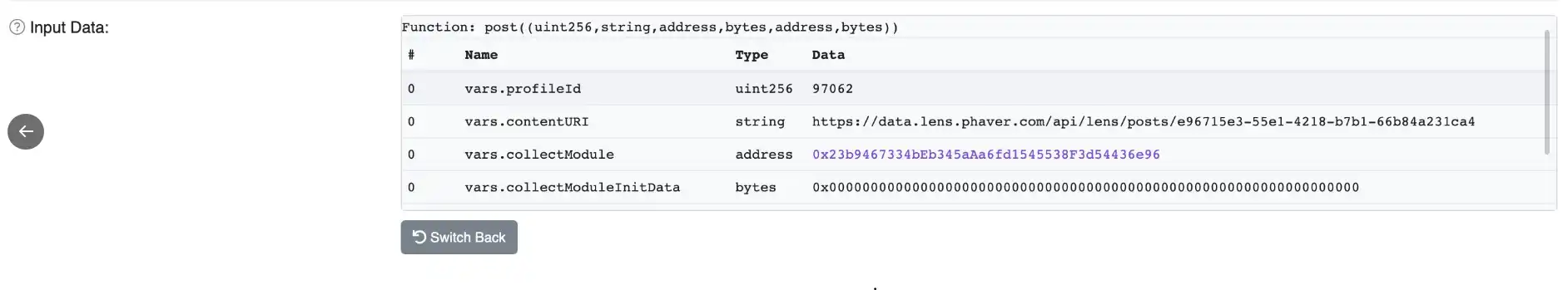 另外对于 post 内容发布,首先它不是作为 NFT 呈现的,我在此之前还以为用户发的内容都会铸造成 NFT,如图 1 所示就是正常的链上数据写入的过程,这里我还没有理解清楚为什么 lens 不把他们做成 NFT。如图 2 这是 post 的写入数据,包含的数据有挂载在谁身上,挂载的内容是什么,发布内容用 contentURI 一个外链来索引 。