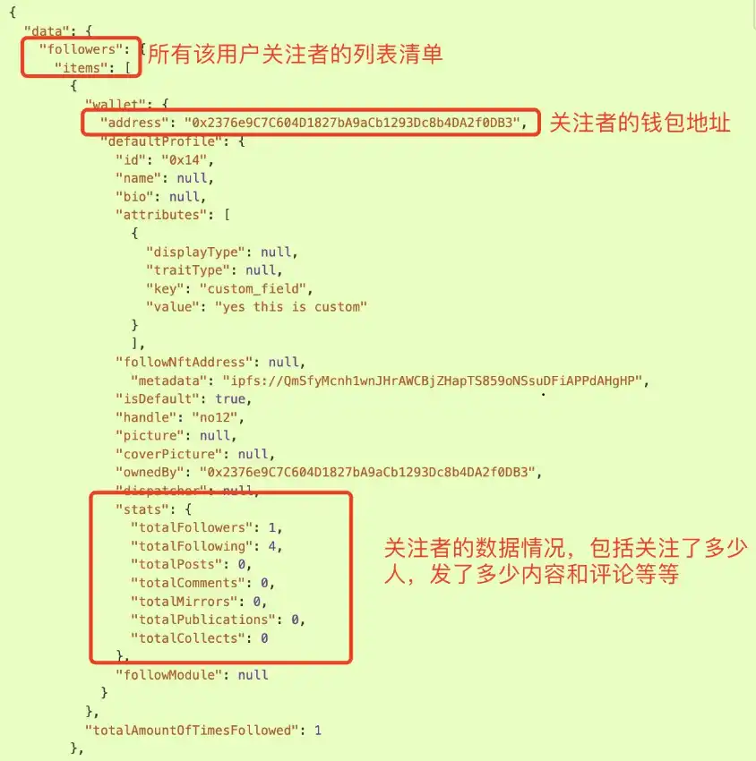 社交数据其实是索引关系非常复杂的,lens 的接口对于开发者也非常方便,将链上数据包了一层不需要开发者自己去分析数据,而是如下图为例,如果需要查询某个人的关注者,通过接口可以直接以很清晰的以拉清单的形式将数据获取到并层层下钻。