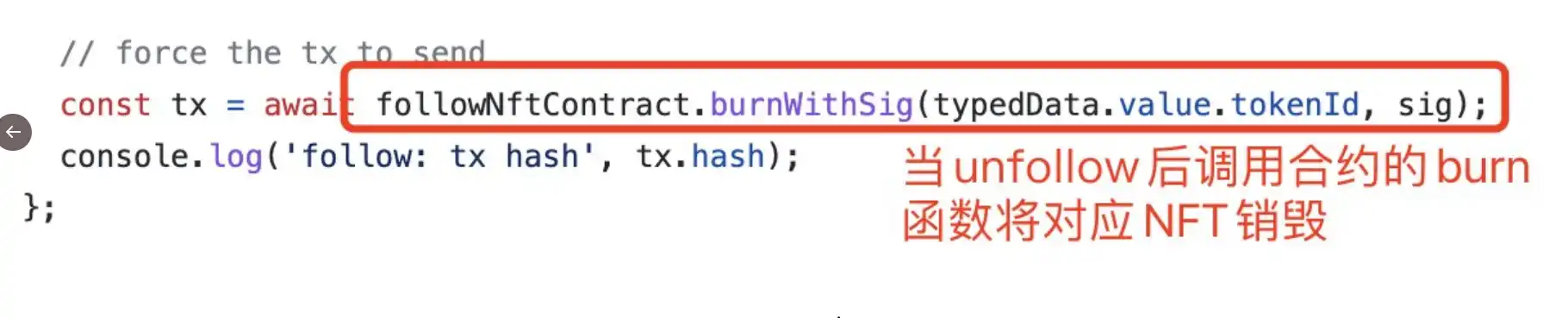 除了域名外用户的关注、收藏等动作也会被铸造为 NFT,如图 1 当用户进行关注时,触发了合约的 follow 函数,从所产生的链上数据可以看到 mint 了一个 NFT,如图 2 当取关的话则会将该 NFT 销毁掉 。