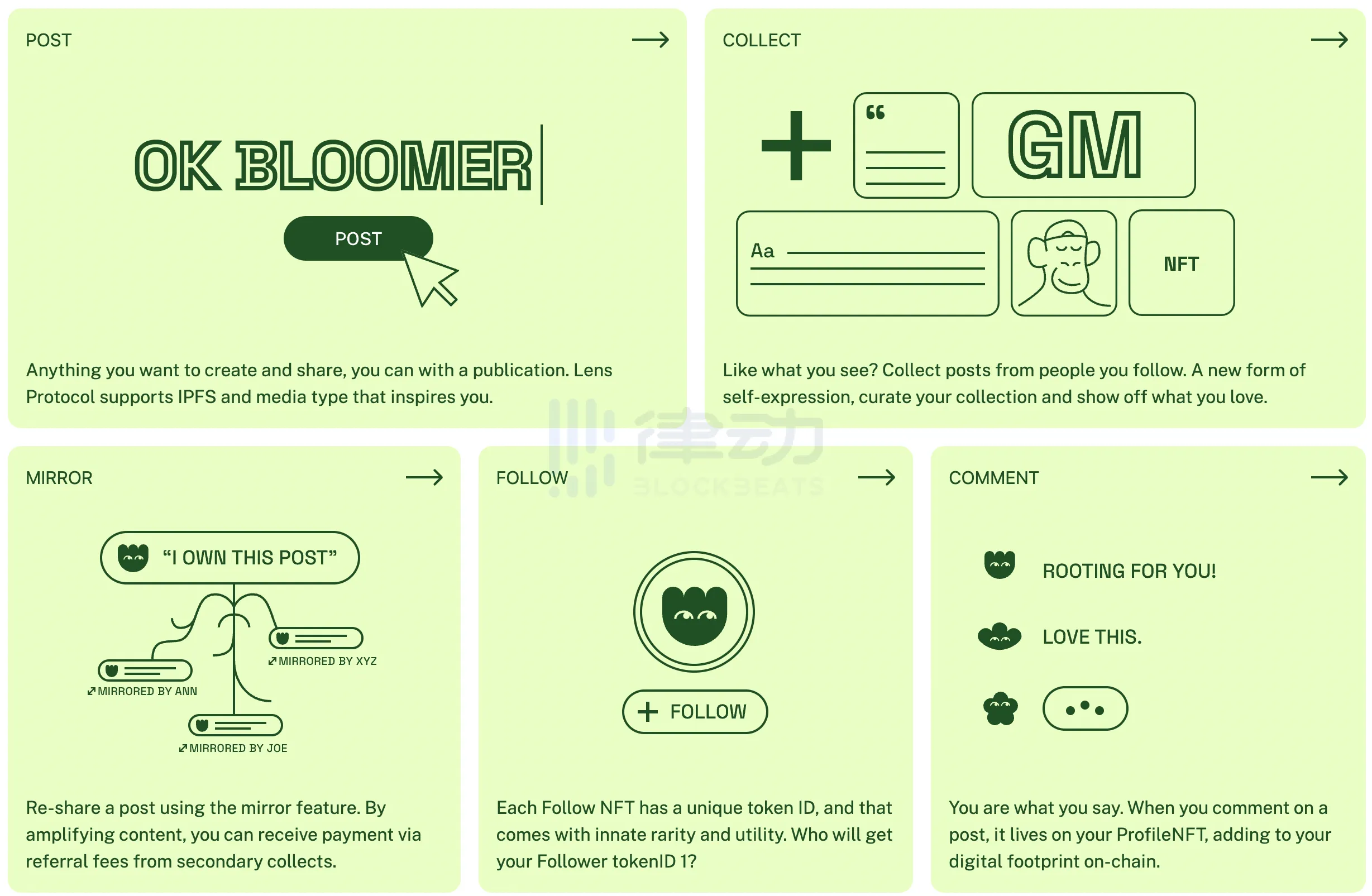 之所以取了与推特等平台不同的名称,是因为这些行为都是在链上完成的,这些行为数据也可以沉淀为用户自己的 NFT,为未来的应用场景提供可能。