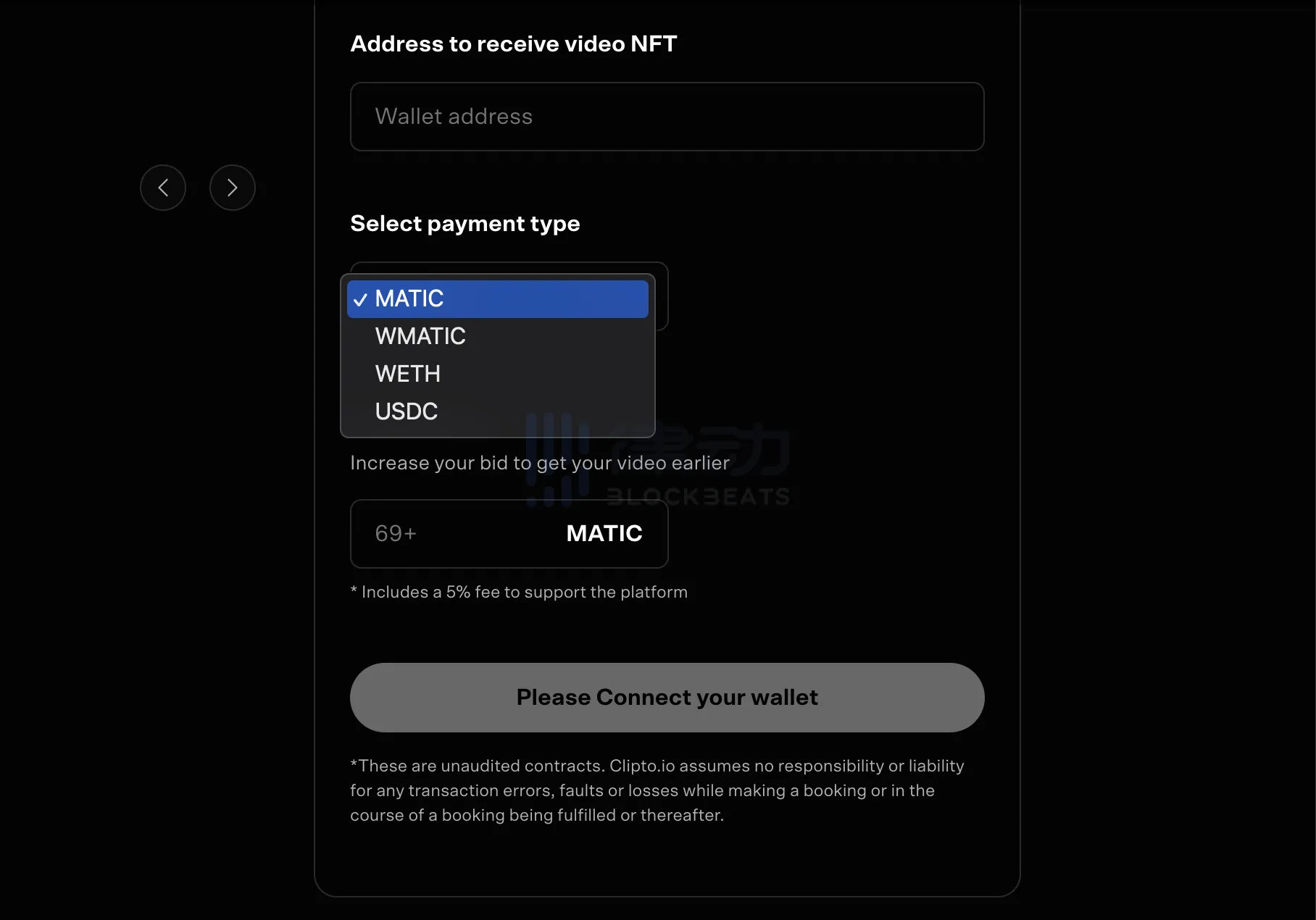 接下来用户需要填写具体接受视频 NFT 的地址,选择支付费用的 Token 种类,以及提供自己的竞标出价。