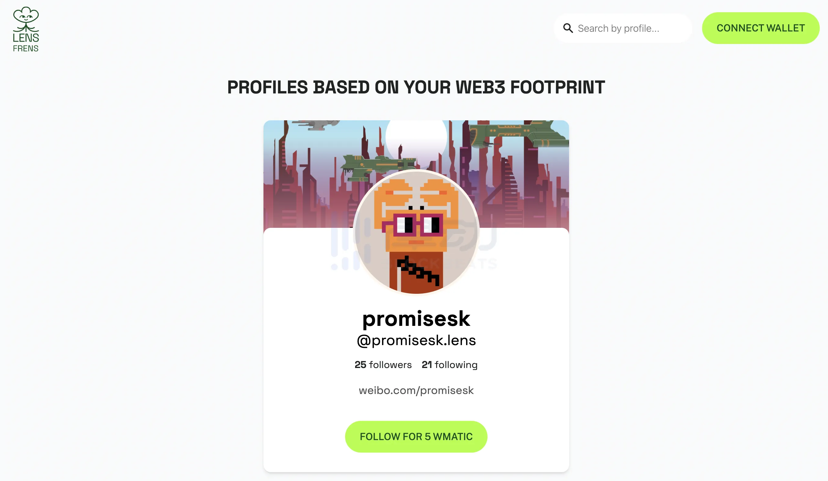 Lens Frens 是 Lens 团队自己打造的应用,用于搜索和关注其他用户在 Lens Protocol 上创建的 Profile NFT。进入Lens Frens主页后,连接钱包即可开始检索和关注。值得注意的是,有的 Profile NFT 是需要支付一定 wMATIC 才可以关注的。