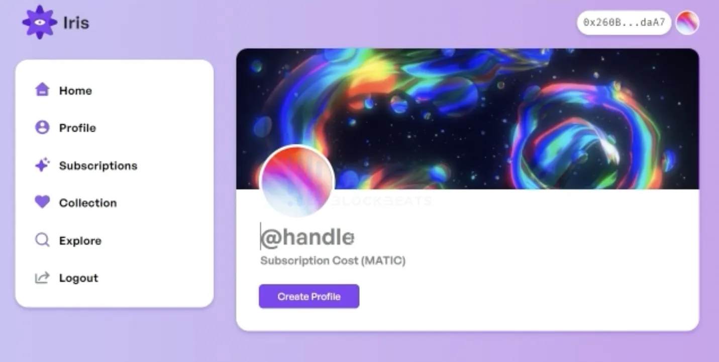 Iris 也是一个 web3 创作者平台,融合了 Twitter、Twitch、Tik Tok 以及 Patreon 等平台的经典要素,用户可以在这里分享自己的独家内容、发展属于自己的社区。进入Iris主页后,链接自己的 Lens Handle 就可以开始创建自己的 Profile 了。