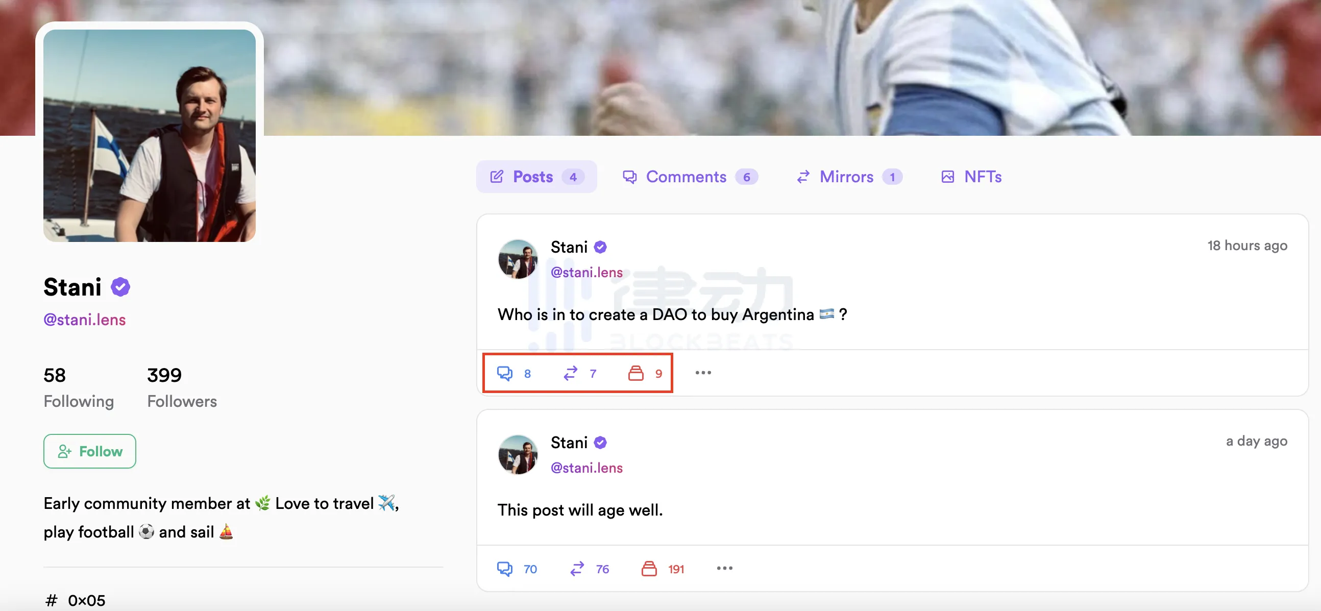 我们先点击进入 Stani 的个人主页看看。左侧是 Stani 的粉丝、关注和个人简介,右侧则是 Stani 在 Lenster 上发表的内容。在下图红色方框中,我们就能看到 Lenster 的主要交互形式,从左至右分别是 Comments、Mirror(即转推)、Collect(即点赞收藏)。