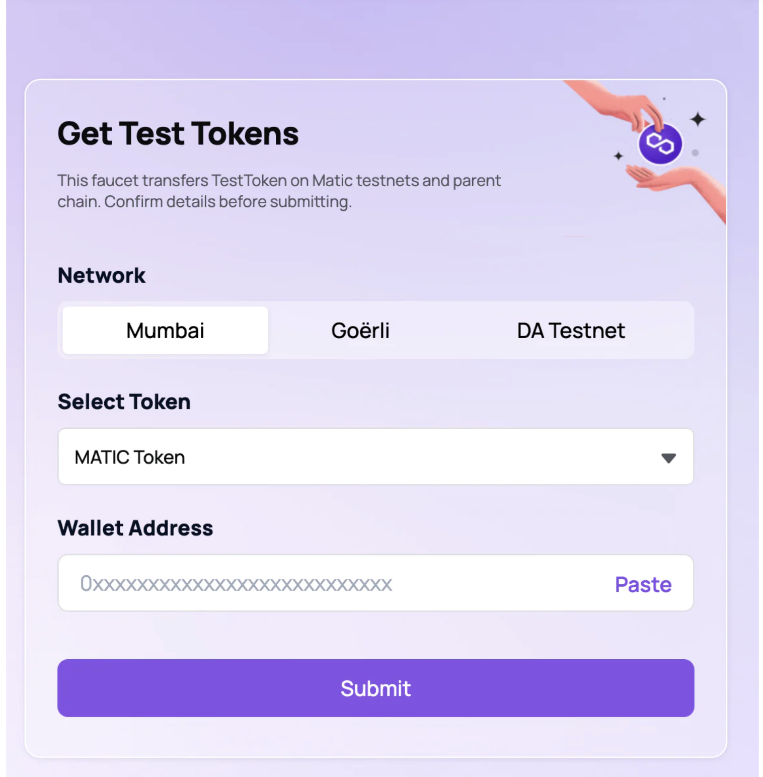 第一步完成后,去领取测试币,在空格里填入你要使用的钱包地址,然后 submit。