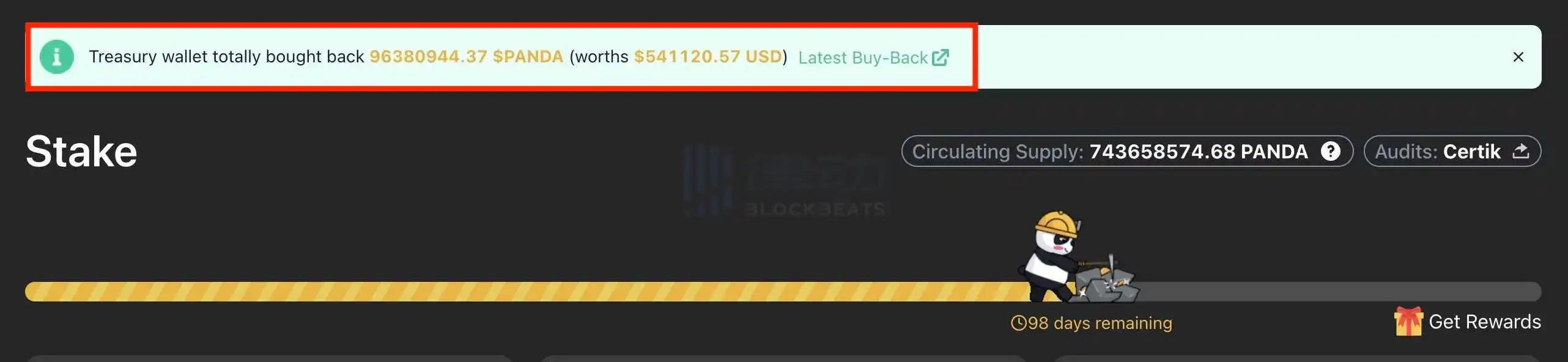 回购价格一开始就设置在 0.005 美金,最初是核心成员在 Uniswap 等公开市场进行公开回购,大约回购了价值 50 多万美金的 PANDA Token。但社区不少人担心会存在内幕交易,团队在去社区讨论后,决定写一个回购合约,把回购资金全部打入协议,让大家自己去合约里然后兑换稳定币。
