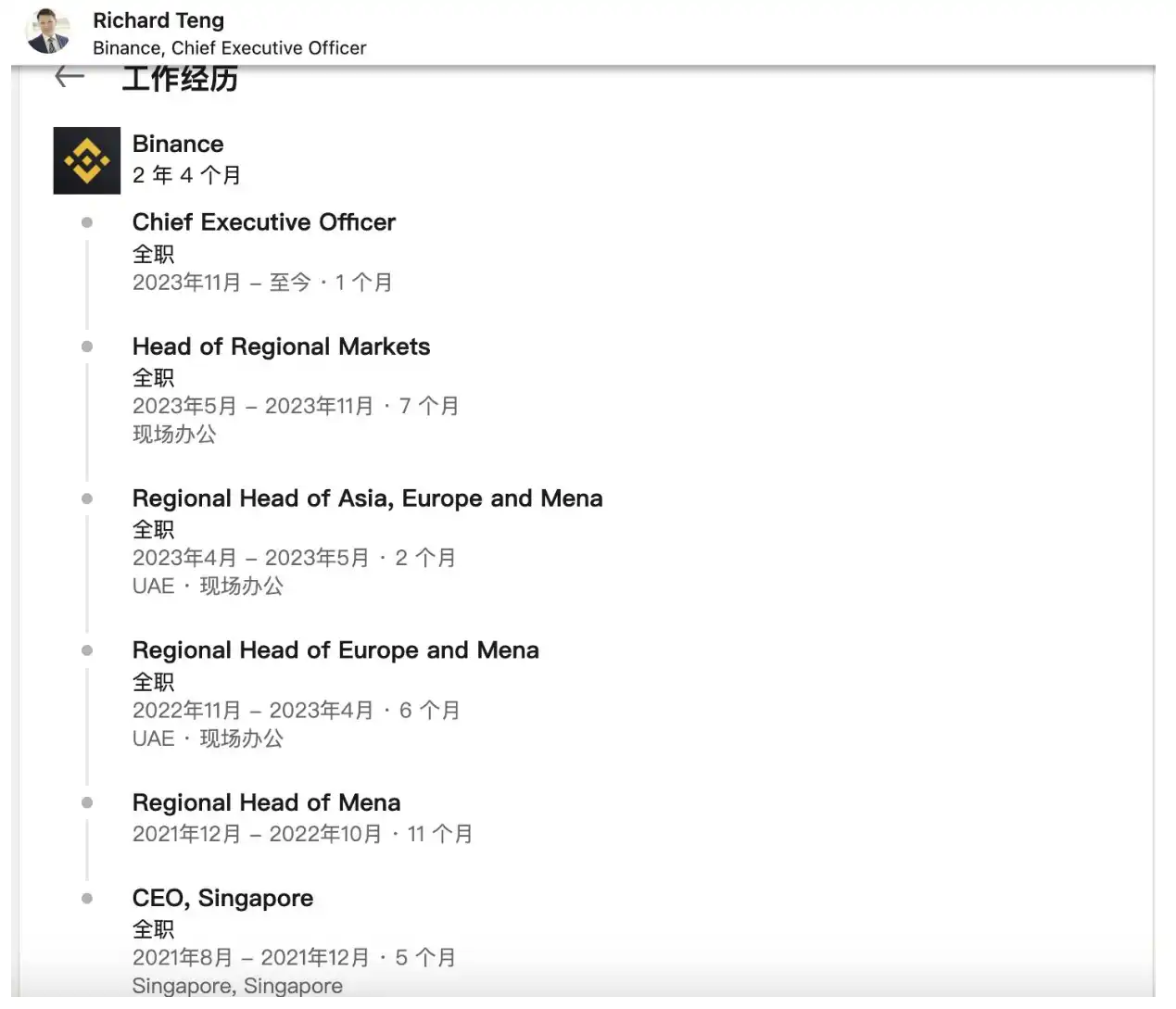 对于大多人来说,Richard Teng 这个名字相当陌生,事实上,他并不算是 Binance 老人,根据Linkedin上的个人资料,Richard Teng 2021 年加入 Binance,至今仅 2 年 4 个月,经历了 5 连跳。