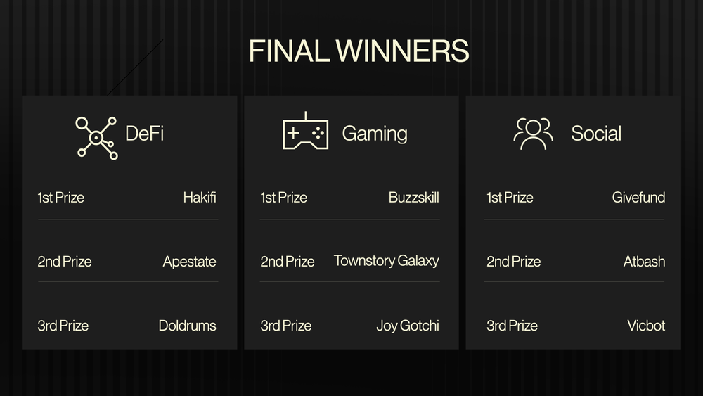 萌币网 消息,Layer1 区块链 Viction(原 TomoChain)公布其 Horizon 黑客松 9 个获奖项目:DeFi 赛道前三名获奖项目分别为去中心化对冲协议 Hakifi、房地产投资平台 ApeState、稳定币协议 Doldrums;游戏赛道前三名获奖项目分别为宏观经济 NFT 策略游戏 Buzzkill - Honeycomb Hustl、加密社交游戏 Town Story Galaxy、虚拟宠物游戏 Joygotchi;社交赛道前三名获奖项目分别为加密筹款平台 GiveFund、以隐私为中心的电子投票平台 Atbash、 Telegram 交易机器人 VICBOT。