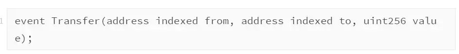 我们可以看到,Transfer 事件共记录了 3 个变量 from,to 和 value,分别对应 Token 的转账地址,接收地址和转账数量。同时 from 和 to 前面带着 indexed 关键字,表示很重要,程序可以轻松的筛选出特定转账地址和接收地址的转账事件。每个事件最多有 3 个带 indexed 的变量。