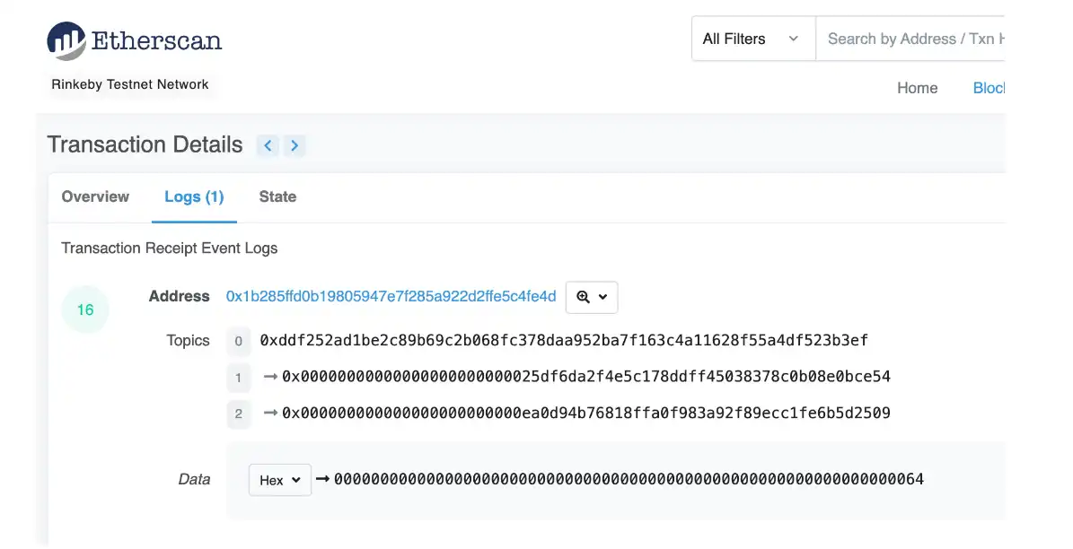 Topics 里面有三个元素,[0] 是这个事件的哈希,[1] 和 [2] 是我们定义的两个 indexed 变量的信息,即转账的转出地址和接收地址。Data 里面是剩下的不带 indexed 的变量,也就是转账数量。