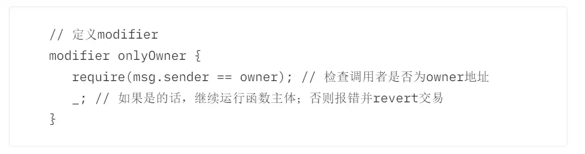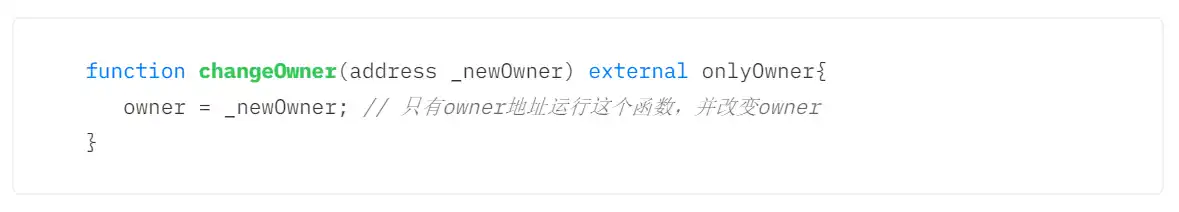 代有 onlyOwner 修饰符的函数只能被 owner 地址调用,比如下面这个例子: