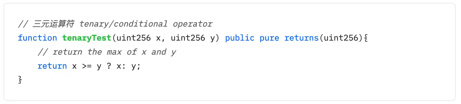 三元运算符是 solidity 中唯一一个接受三个操作数的运算符,规则 条件? 条件为真的表达式:条件为假的表达式。此运算符经常用作 if 语句的快捷方式。
