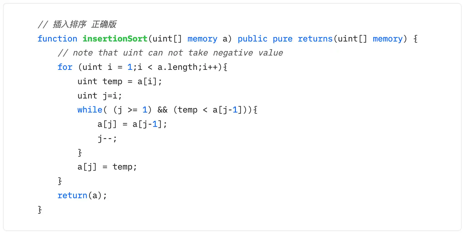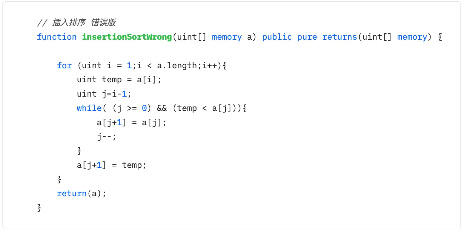 花了几个小时,在 Dapp-Learning 社群一个朋友的帮助下,终于找到了 bug 所在。solidity 中最常用的变量类型是 uint,也就是正整数,取到负值的话,会报 underflow 错误。而在插入算法中,变量 j 有可能会取到-1,引起报错。