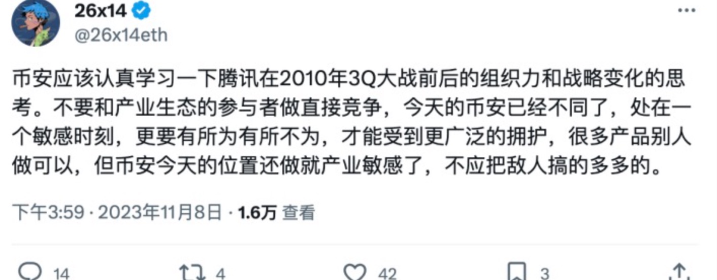 投研社区7updao创始人@26x14eth则将币安和腾讯对比,直言币安应该学习腾讯在2010年3Q大战前后的组织力和战略变化的思考,不要和产业生态的参与者做直接竞争。因为对于当下的币安处在一个敏感时刻,“不应把敌人搞的多多的。”