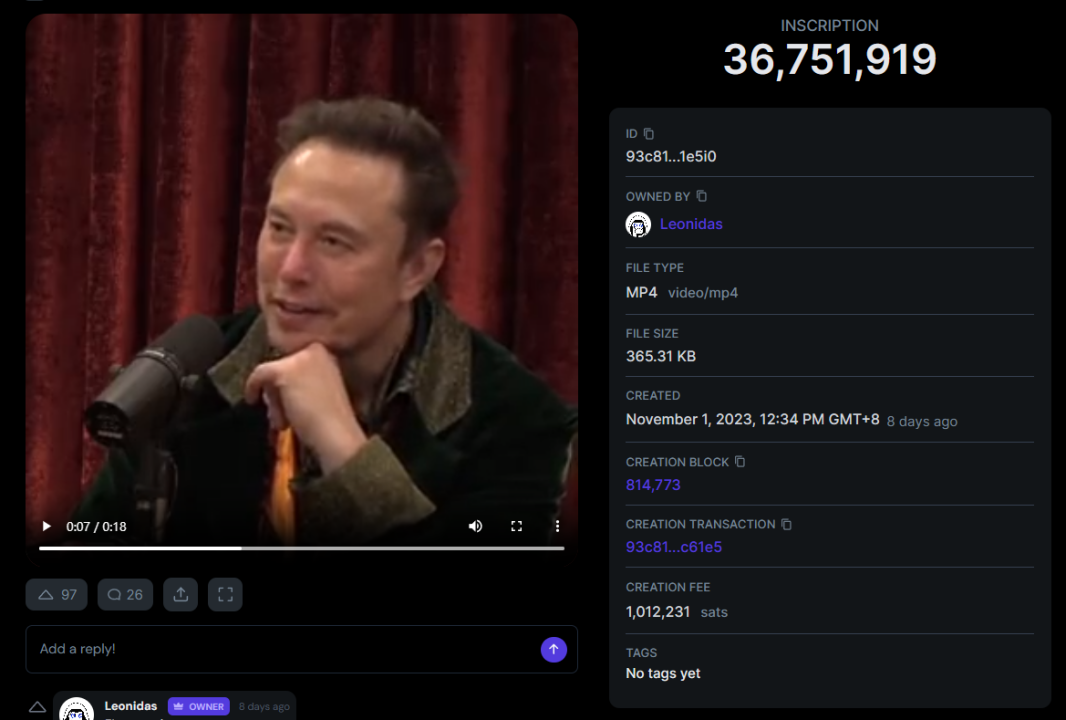 通过Ordinals协议刻在比特币区块链上的视频。来源:Ord.io