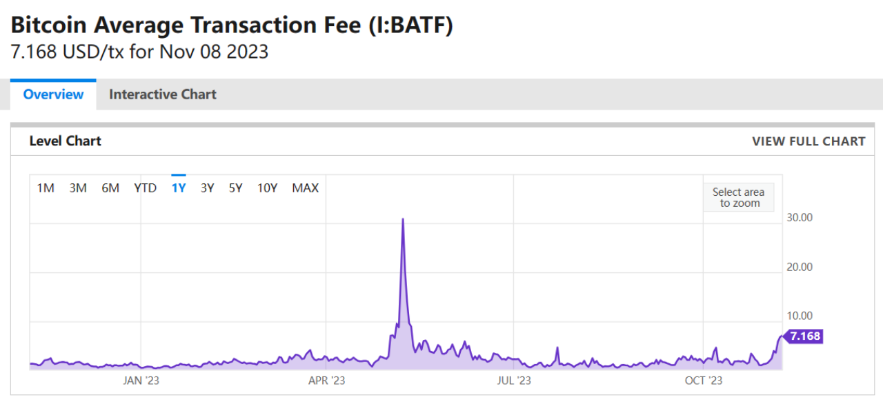显而易见是,与更年轻、更灵活的同类相比,比特币的交易处理速度显得缓慢。因此,Ordinals 怀疑论者警告称该协议将导致网络拥塞,当 10 月份比特币交易费用开始攀升时,他们的担忧得到了证实。今年夏天,比特币平均交易费用的波动幅度在 1 美元的 20% 以内,但在 11 月 8 日,比特币平均交易费用上涨至 7.168 美元,创下 6 个月以来的新高。