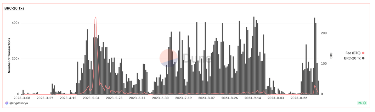 两个月后,一个名为domo的神秘工程师发布了BRC-20,向社区宣告,比特币生态也可以实现发币自由。本质上讲 BRC-20还是以 Ordinals 协议为基础,通过向网络部署 JSON 文件自定义代币供应、发型限额等代币的基本条件, 以 BRC-20 为标准铸造的代币可以在钱包间自由转移。虽然说上文将 BRC-20和 Ordinals 与以太坊链上的ERC标准类比。但最重要的不同在于比特币网络上基于Ordinals创造的小图片和代币直接铭刻在单个聪上,由于比特币本身的特性直接“经典咏流传”。至此,关于比特币生态扩展的讨论再次被推向顶峰,BRC-20 交易量也在近一个月之后达到了近40万之多,然而在急速攀升的交易量背后不可忽视的是高达255BTC的当日总交易费用。