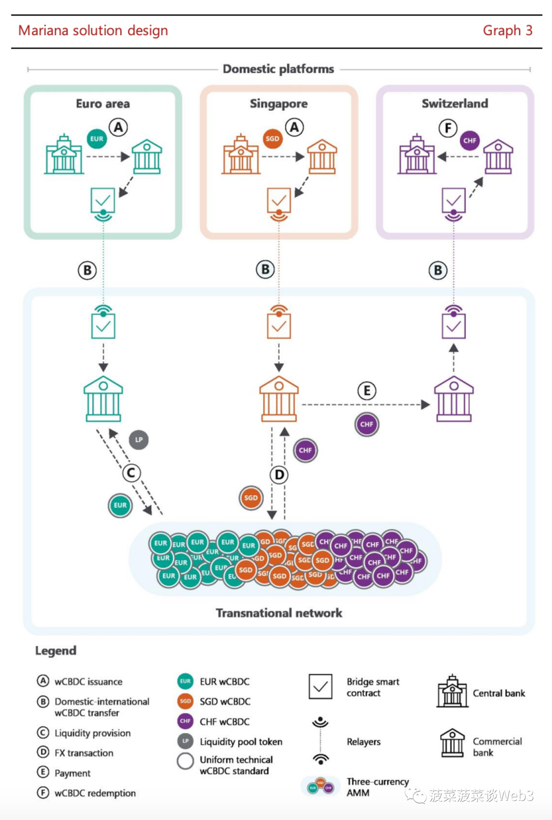 由国际清算银行创新中心 (BISIH)、法国中央银行 (Bank of France)、新加坡金融管理局(MAS)和瑞士中央银行瑞士国家银行 (Swiss National Bank) 合作进行的马里亚纳计划(Projeto Mariana)于2023年9月28日发布了测试报告,该计划成功验证了将自动做市商 (AMM)用于通证化央行数字货币 CBDC 的国际跨境交易和结算的技术可行性[14]。